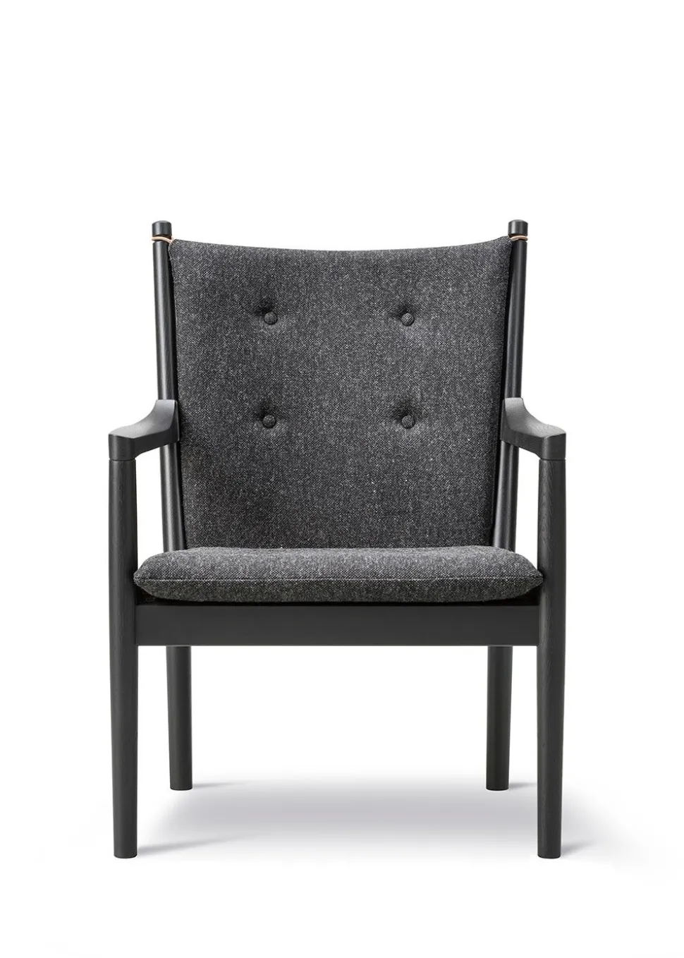 Der Sessel hat nicht nur den Status des „Tremmesofaens“ erlangt, sondern auch den Weg auf den internationalen Markt gefunden. Der Stuhl imitiert einige Merkmale des Tremmesofaen“, ist aber vor allem dafür bekannt, dass er den skulpturalen Aspekt von Wegners Design repräsentiert. Der Sitz hat einen leichten Winkel, der den Komfort eines Sessels bietet und gleichzeitig ein formelles und schönes Profil aufweist. Der Komfort des Stuhls wurde mit einem traditionellen dänischen Design kombiniert, das, charakteristisch für das Design der Zeit, das Holz als tragendes Material des Möbels einbezog. Der optische Holzrahmen bildet den Rahmen für die eleganten Kissen, die durch Knöpfe ergänzt werden, die dem Kissen zusätzliches Volumen verleihen. Der Sessel ist in der ikonischen Textilie Cotil erhältlich, die mit ihren charakteristischen Karos und traditionellen Farben dazu beiträgt, den ursprünglichen Geist des Möbels zu bewahren, und die perfekt zum behandelten Holz passt.