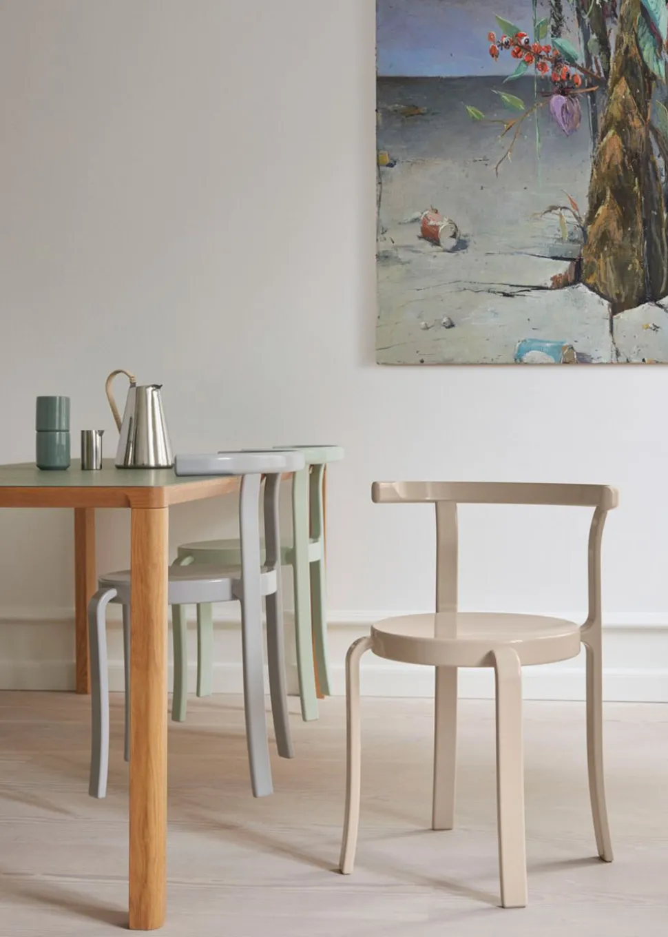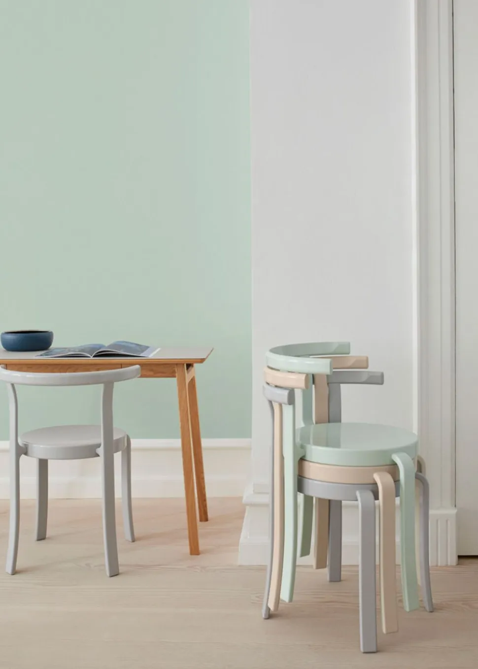 Das Design der 8000er-Serie ist ikonisch. Die Serie wurde von Rud Thygesen und Johnny Sørensen entworfen und wird seit 1981 von hergestellt. Die Möbel werden auf einzigartige Weise zusammengebaut, sodass keine Schrauben oder Dübel benötigt werden. Trotz seines geringen Gewichts ist das Möbelstück unglaublich flexibel und äußerst stabil. Viele Menschen kennen den Stuhl noch aus ihrer Kindheit in Schulen und Einrichtungen.