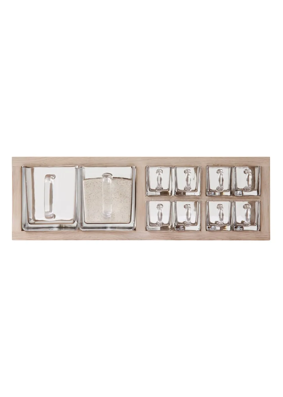 - Material: Aus weiß pigmentierter Eiche mit Mattlackierung und Glaskrügen.