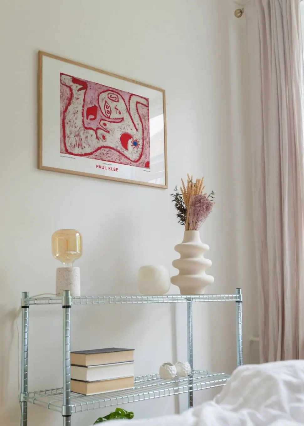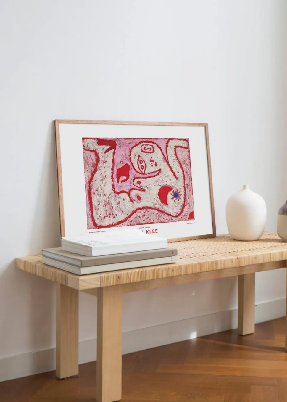 Das Poster ist ein abstraktes, illustriertes Poster mit schönen warmen Rottönen. Paul Klees einzigartige, farbenfrohe und abstrakte Kunstplakate zeichnen sich durch seine einfallsreichen und eleganten Techniken aus. Die ebenso schönen wie eleganten rötlichen Details schaffen eine gemütliche Atmosphäre für Ihr Zuhause.