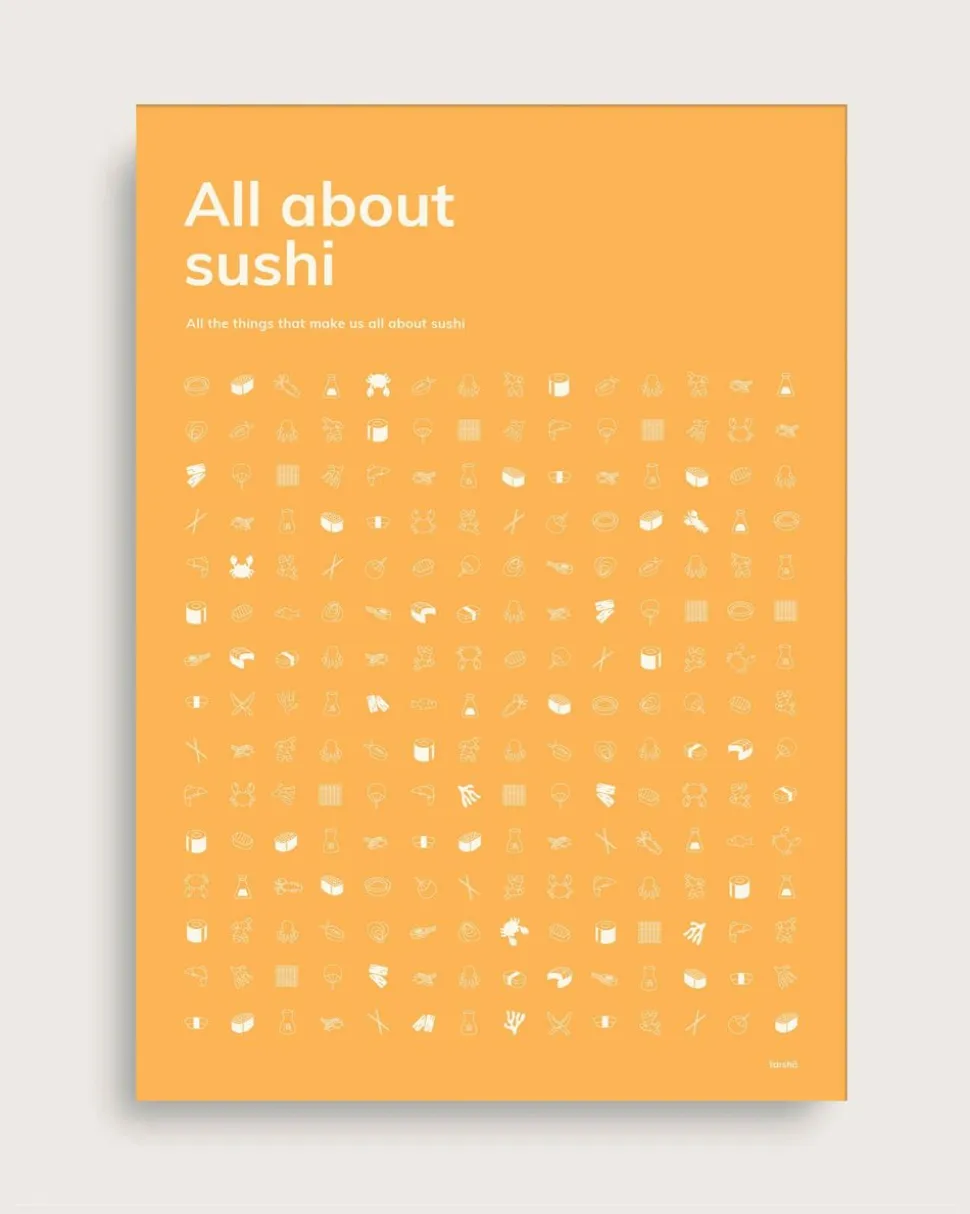 Es gibt nichts Köstlicheres als eine Portion Sushi. Das „All About Sushi“-Poster von hat die kultigsten Dinge zusammengetragen, die wir von Sushi kennen. In niedlichen kleinen Zeichnungen sind Stäbchen, Fisch und natürlich Sushi-Stücke zu sehen.