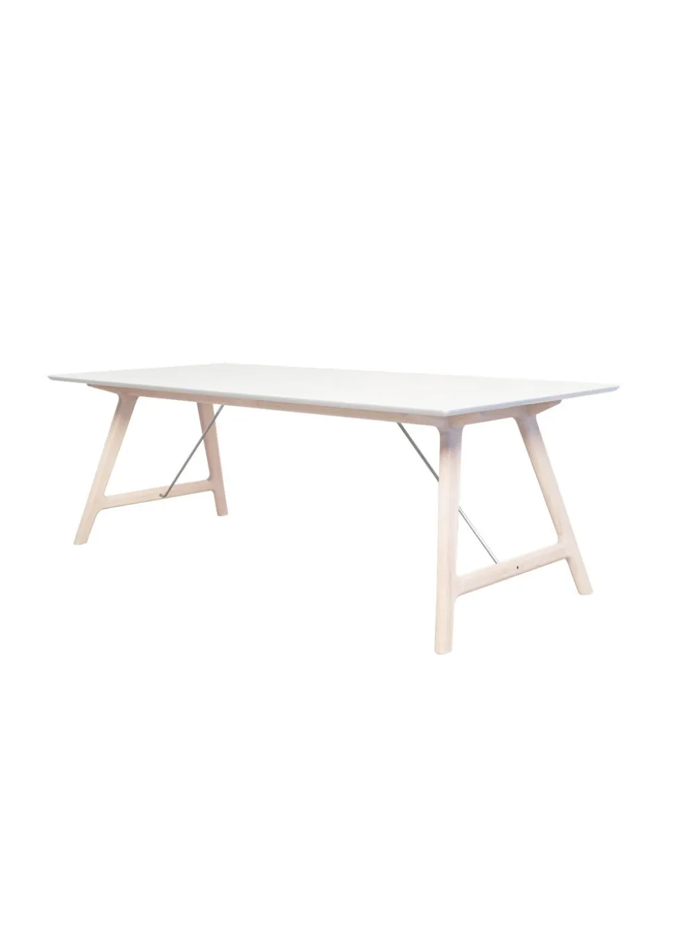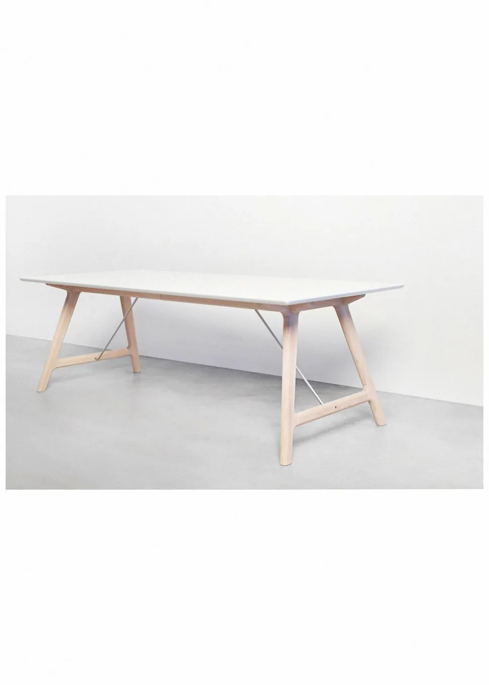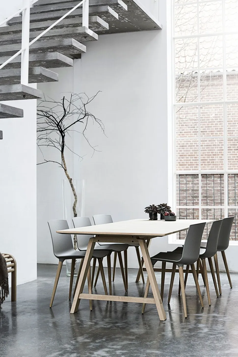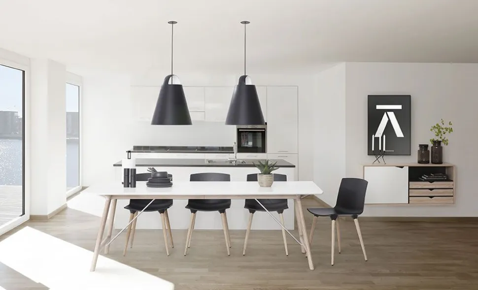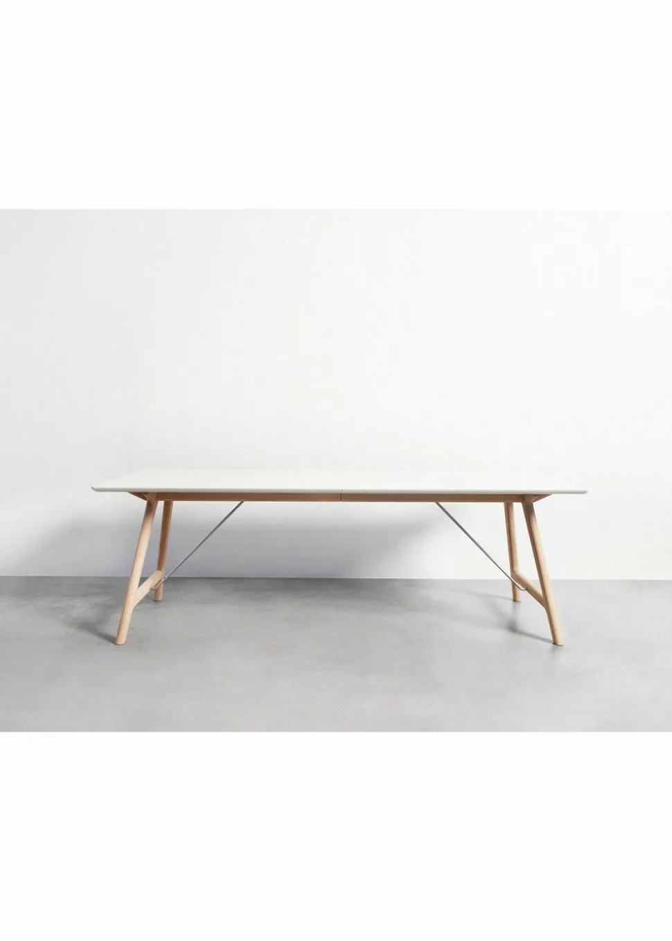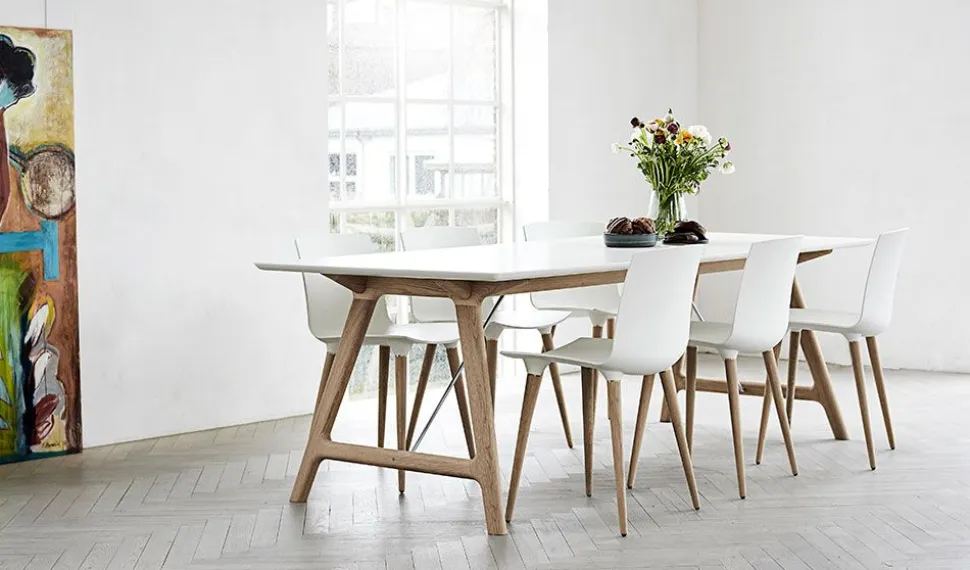 Ditlev Karsten hat einen neuen klassischen und schönen Esstisch entworfen, den T7. Genießen Sie das weiche Design und den Ausdruck des Tisches. Die Tischplatte ist aus farbigem weißem Laminat oder schwarzem Fenix-Laminat und das Gestell aus massiver Eiche. Er ist mit der Oberflächenbehandlung Wood Care behandelt, die nur minimale Wartung erfordert. Sie können auch ein schwarz lackiertes Gestell wählen. Der T7 hat ein Design, das die Materialien zur Geltung kommen lässt. Praktisch und elegant. Verlängerungen für Erweiterungsplatten lassen sich leicht einsetzen und schaffen schnell zusätzlichen Platz am Tisch.