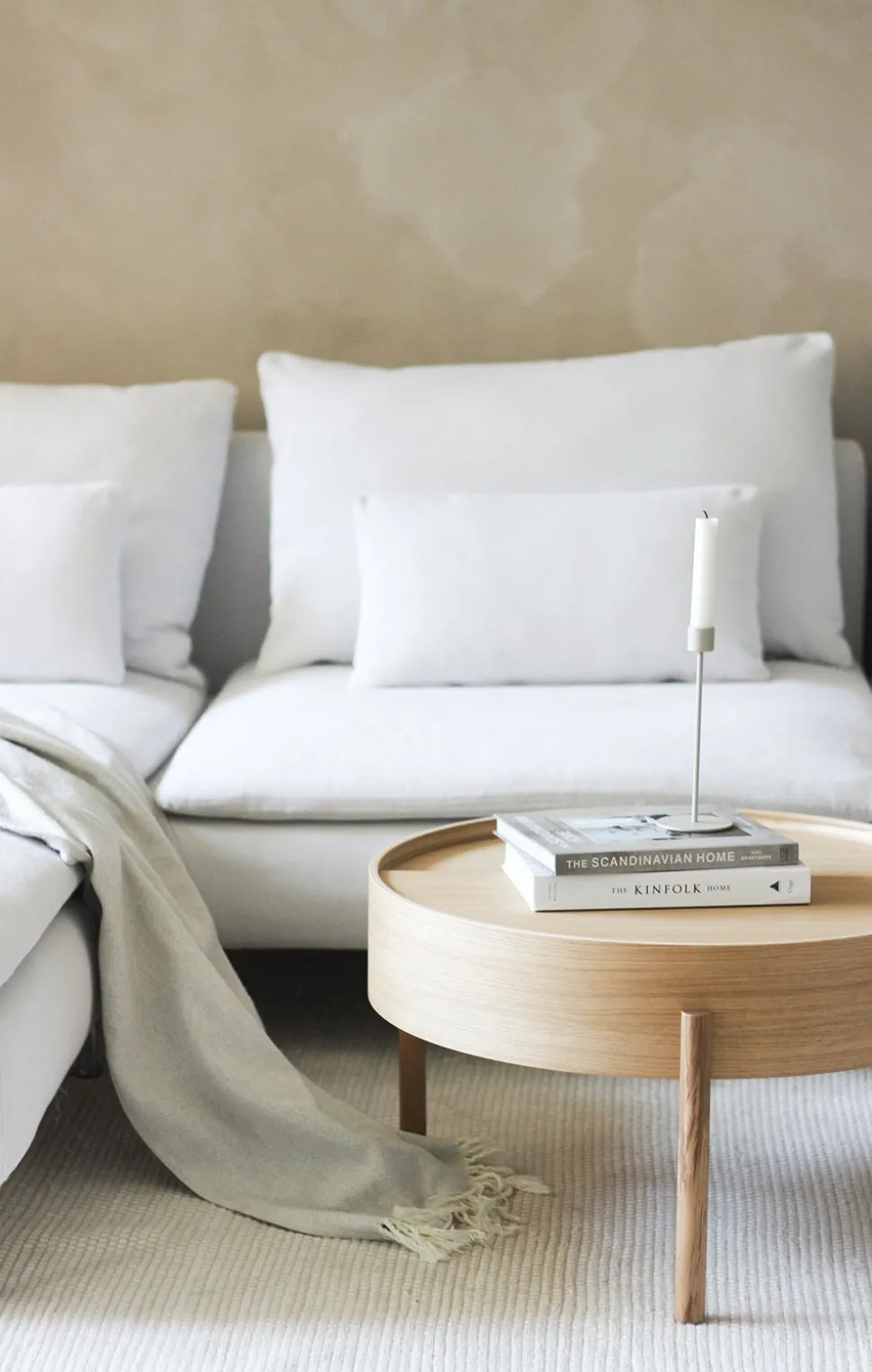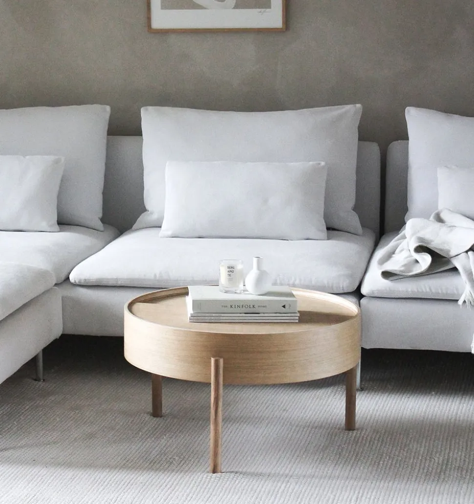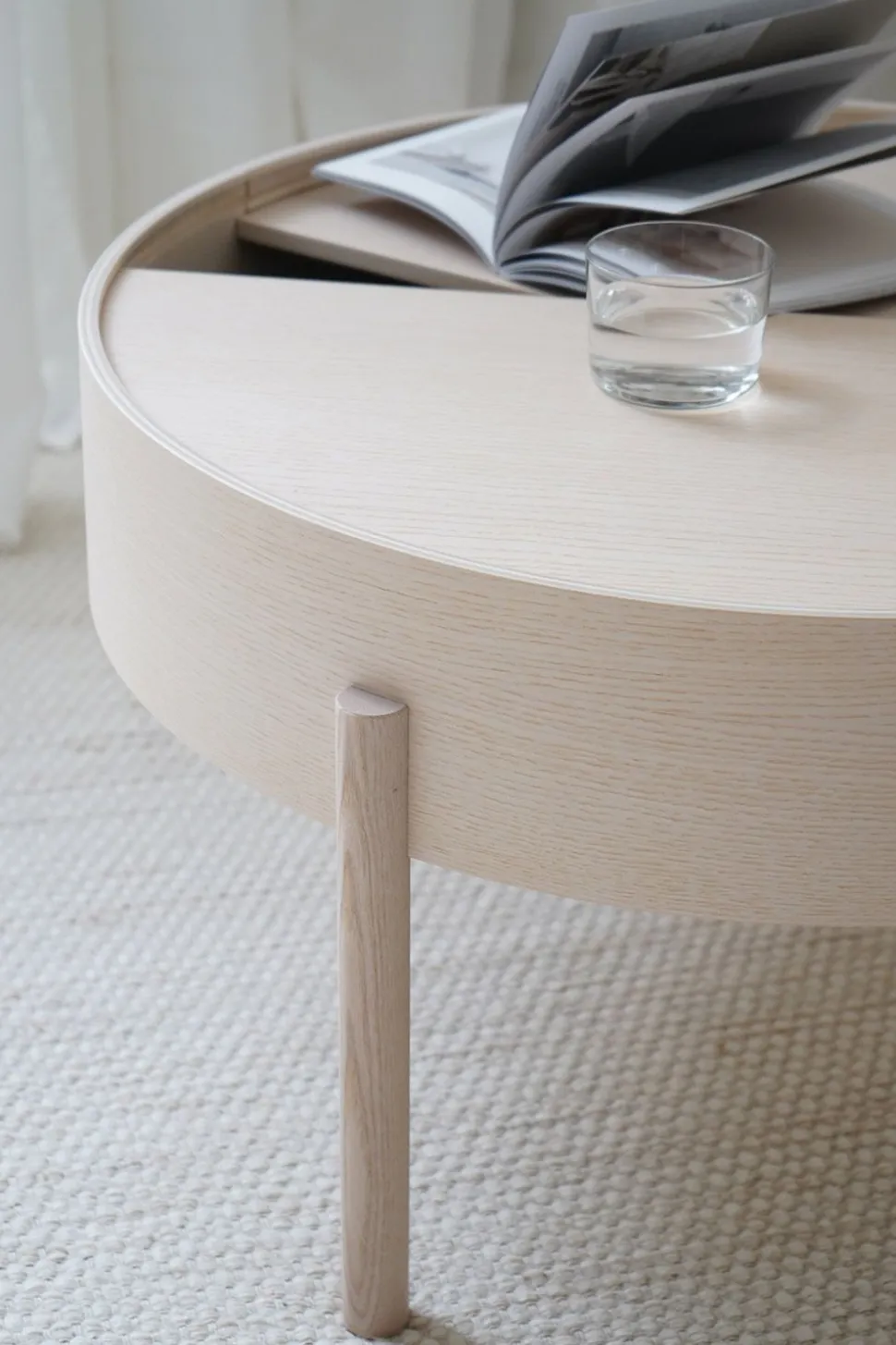 ARC Beistelltisch und Couchtisch wurden von Julie Begtrup und Ditte Vad entworfen. Der Name leitet sich von dem mathematischen Konzept einer glatten Kurve ab, die zwei Punkte in einem Kreis verbindet. Die Tische verfügen über funktionale Merkmale, die den Benutzer zur Nutzung anregen. Sie können den oberen Tisch leicht mit einem Finger öffnen. Die Tischplatte kann offen gelassen werden, um Ihre Lieblingssachen zu präsentieren, aber Sie können den Deckel auch geschlossen lassen, um die Dinge darin zu verstecken.