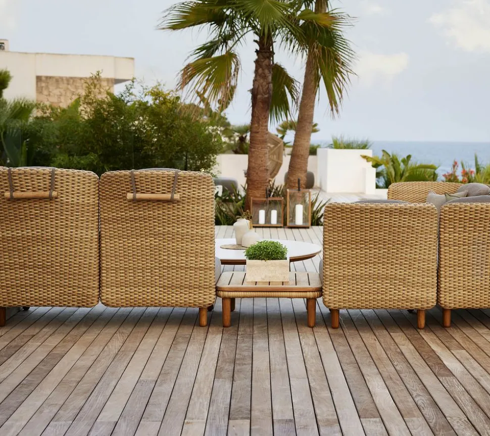 Zusammen mit dem naturfarbenen Geflecht verleiht das Teakholz dem Design des Stuhls eine warme und einladende Ausstrahlung. Stellen Sie den Loungesessel zusammen mit den anderen Modulen der Arch-Serie auf die Terrasse.