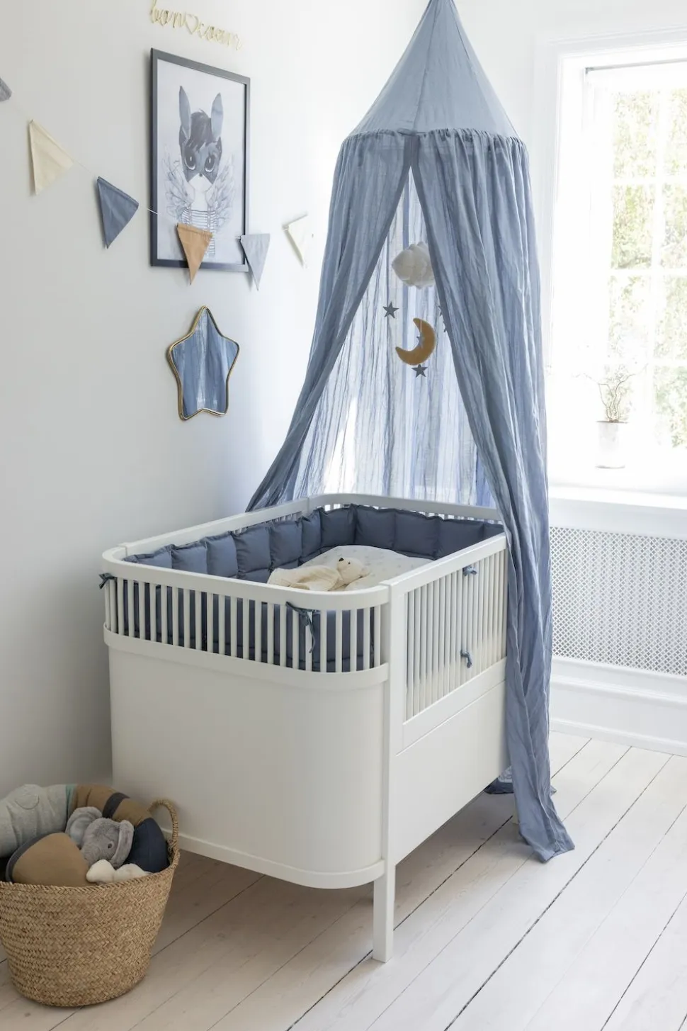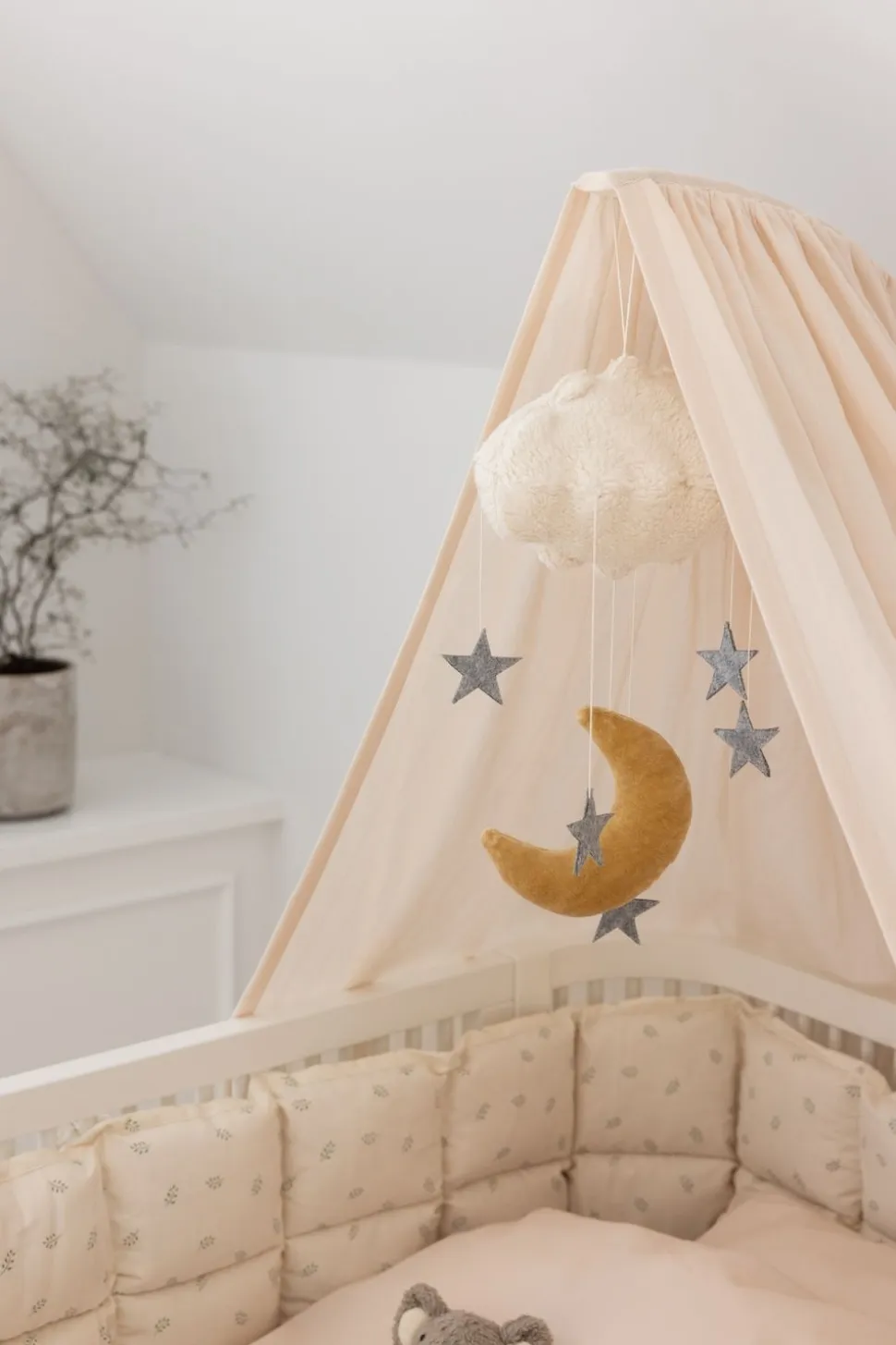 Baby Uro von ist eine verträumte Wolke, die Magie in den Alltag Ihres Kindes bringt. Kleine Sterne und ein gefilzter Mond hängen an dem weichen Velours-Himmel, der in ruhigen Farben gestaltet ist und in jedes Kinderzimmer passt. Mit seinen sanften Bewegungen und schönen Details lädt das Mobile zu Ruhe und Neugierde ein und zieht kleine Augen über dem Bett, dem Kinderbett oder dem Wickeltisch in seinen Bann.