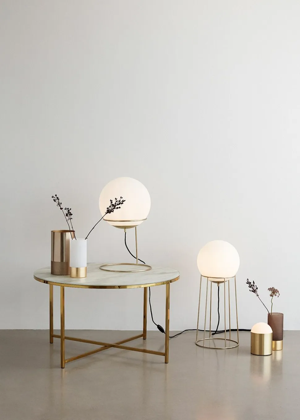 Einzigartige und elegante Stehleuchte aus Dänisch . Die hellen geometrischen Formen und das minimalistische Design der Leuchte passen perfekt zum skandinavischen Zuhause und verleihen dem Raum einen spielerischen und unterschiedlichen Ausdruck. Die Lampe ist aus feinem Messingmetall und elegantem Opalglas gefertigt.
