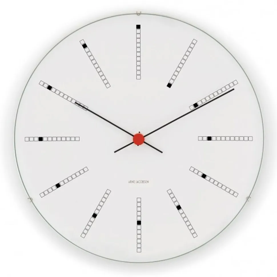 gewinnt 1961 den Wettbewerb für die Dänische Nationalbank, und das Gebäude wird 1978, sieben Jahre nach seinem Tod, fertig gestellt. Banker’s Clock befindet sich in der Veranda und führt als Kathedrale fast 20 Meter hoch durch alle sechs Stockwerke des Gebäudes. Die Wände sind mit Marmor verkleidet, und etwas Tageslicht strömt durch schmale vertikale Fensterschlitze. Die Serie ist sowohl als Wanduhr als auch als Tischuhr erhältlich. Die Wanduhr ist in vier verschiedenen Größen erhältlich und wird mit ihrem klassischen und zeitlosen Design in jedem Raum bequem sein.