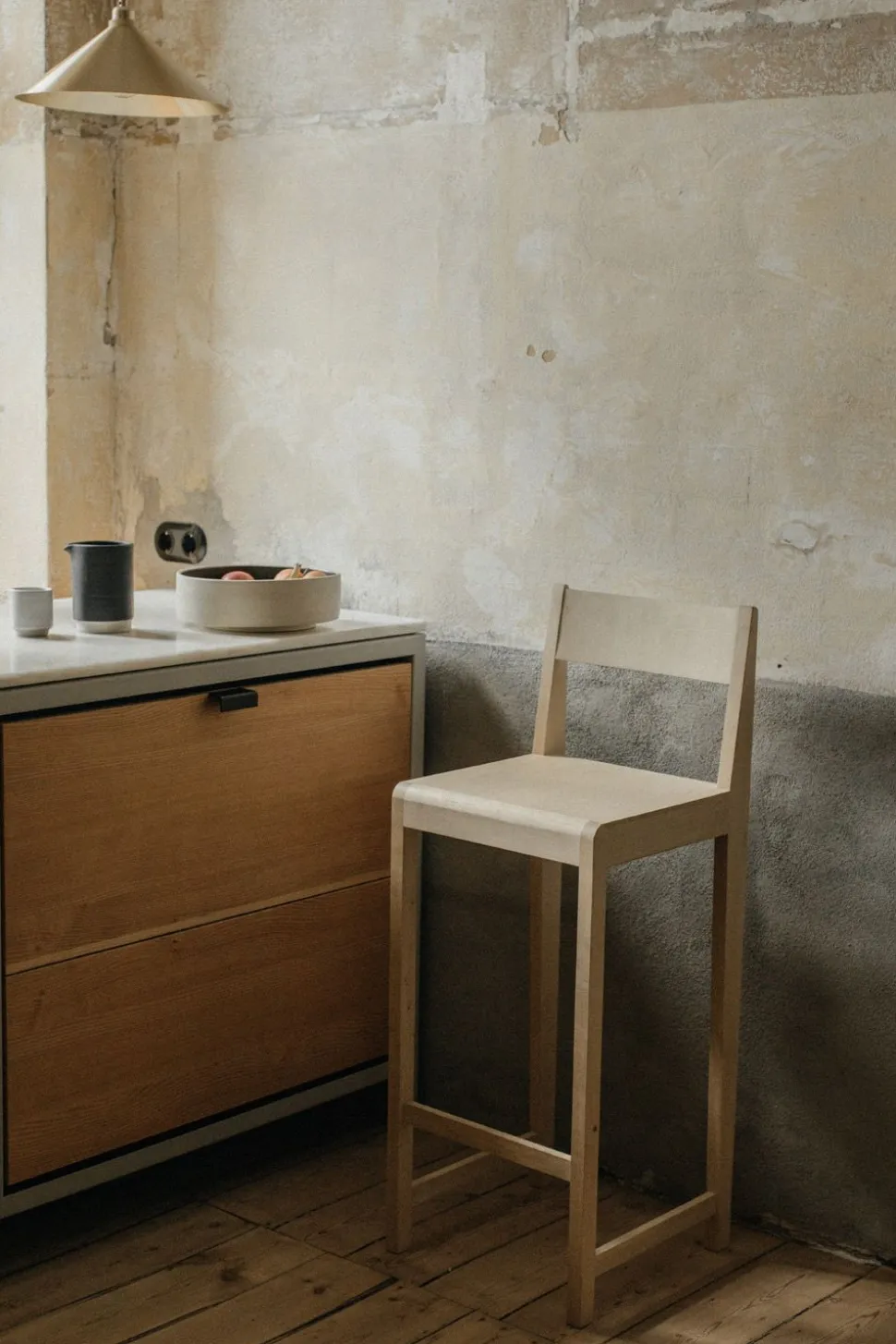 Der Barstuhl 01 von hat ein schönes und klassisches Design, das sich durch weiche Kanten und gerade Linien auszeichnet. Die hohe Rückenlehne und die Fußstütze des Barhockers bieten einen guten Sitzkomfort, der sich perfekt für den Stehtisch in der Küche oder im Büro eignet.