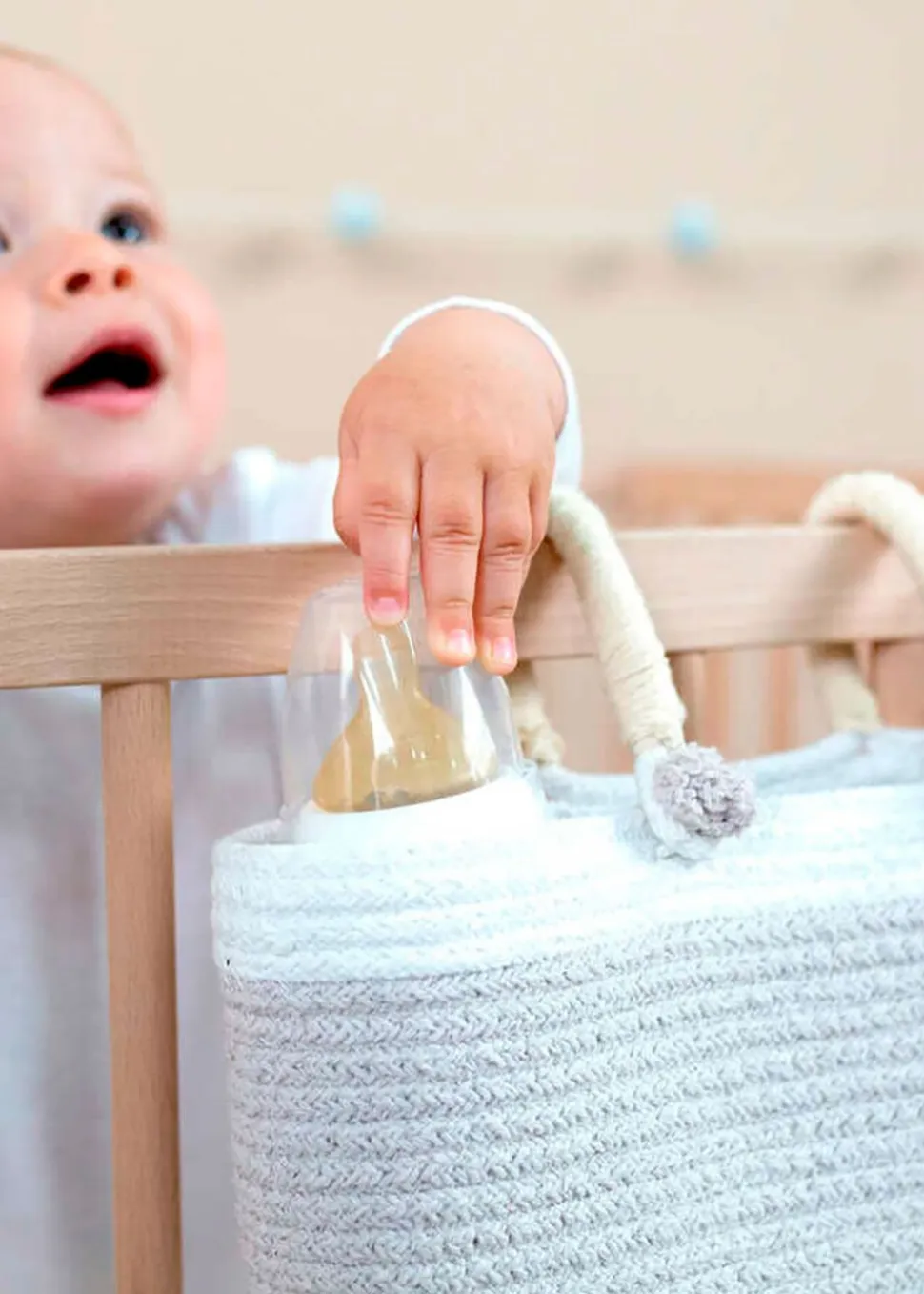 Der Korb eignet sich perfekt zum Aufhängen im Kinderzimmer, an der Wickelkommode oder am Kinderwagen. Der Korb besteht aus weicher Baumwolle und ist so konzipiert, dass die wichtigsten Dinge für das Baby immer griffbereit sind. Er ist in einem schönen Weiß gehalten, hat einen eleganten gestreiften Rand und ist mit süßen kleinen Bommeln verziert.