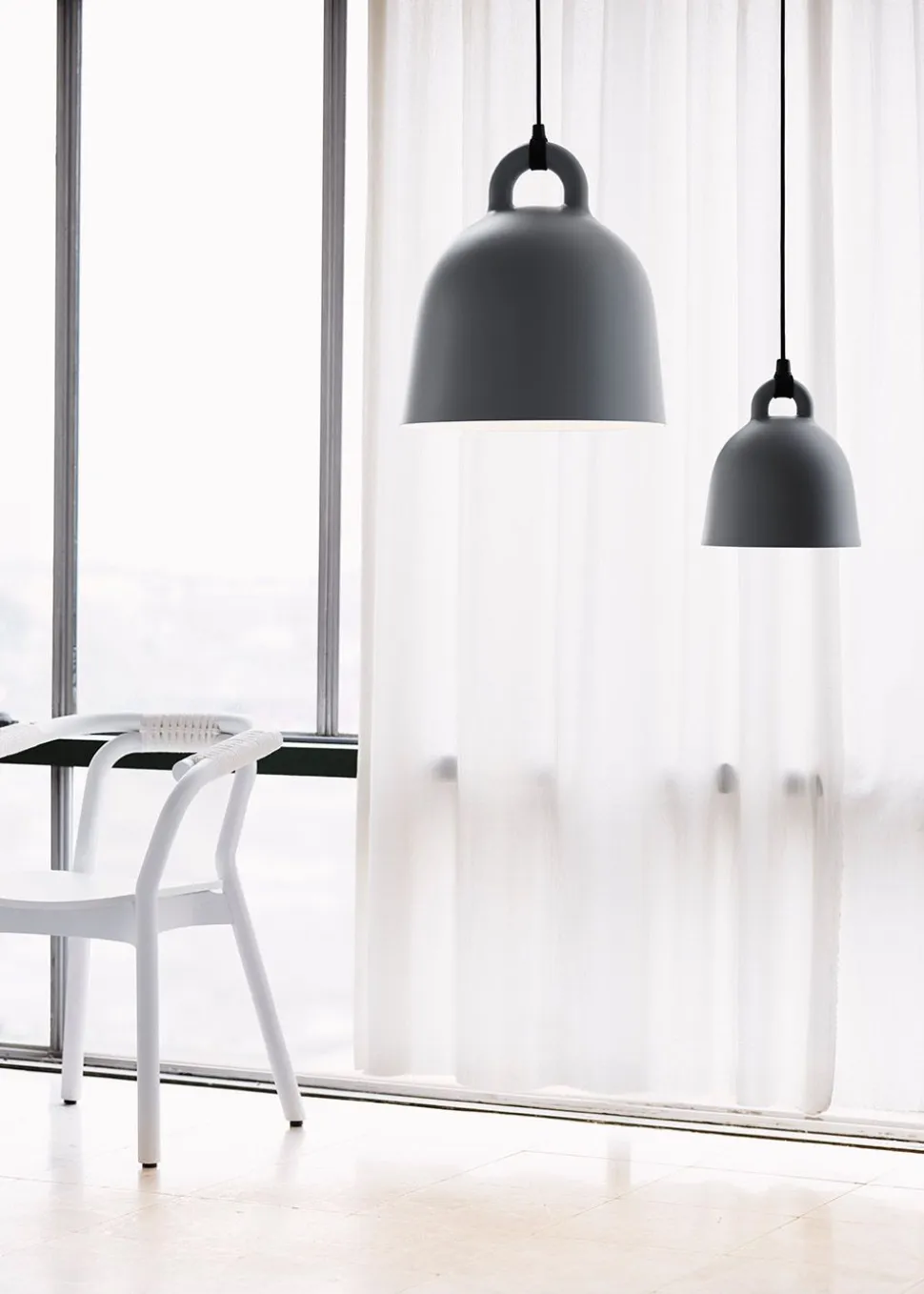 Bell wurde von Andreas Lund & Jacob Rudbeck entworfen. Der Name kommt von der Glockenform der Lampe. Der Ausdruck ist robust, einfach und äußerst modern. Die Lampe ist in verschiedenen Farben und Größen erhältlich. Die Glocke ist aus Aluminium und Gummi gefertigt, was ein effektives Materialspiel ermöglicht.
