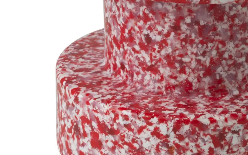 Der sehr strenge Look des Hockers wird durch eine charakteristische, gepixelte Oberfläche unterbrochen, die aus kleinen Stücken von 100% recyceltem Industrie- und Haushaltskunststoff besteht. Durch ein spezielles Verfahren, bei dem Kunststofffragmente bis zum Schmelzpunkt bei 120 Grad erhitzt werden, kann das Material unzählige Male wiederverwendet und umgeschmolzen werden, ohne dass sich seine Eigenschaften verändern. Das Ergebnis ist eine einzigartige Tiefe und Komposition, die jeden Bit-Tisch zu seinem eigenen macht.