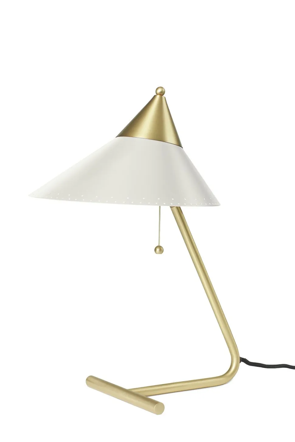 Die Leuchte „Brass Top“, entworfen vom Dänen Svend Aage Holm-Sørensen, ist zugleich ein Paradebeispiel für die modernistischen Trends der 1950er Jahre und Holm-Sørensens einzigartiges Gespür dafür, Licht in figurativen Designs einzufangen. Der breite, skulpturale Schirm mit exklusiven Messingdetails spendet ein weiches Licht und ruht auf einem eleganten Messingsockel, die zusammen ein asymmetrisches Meisterwerk mit attraktivem Licht ergeben. Als einzigartiges Detail, das dem Stil der 50er Jahre entspricht, wird die Leuchte über einen traditionellen Zuglichtschalter eingeschaltet, der der Leuchte den letzten Schliff verleiht.