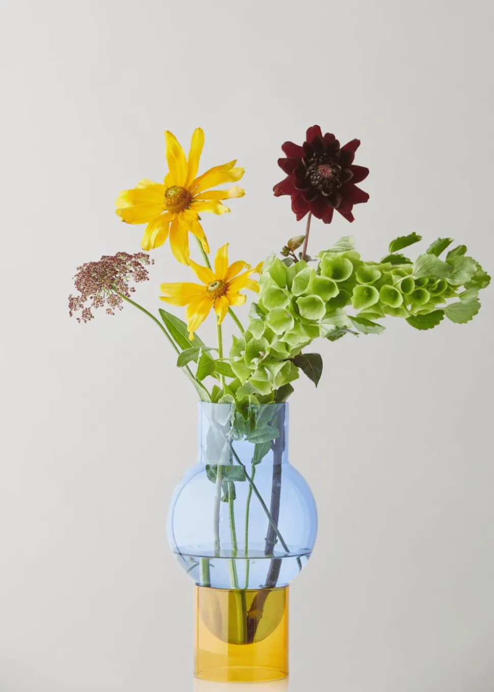 Die Glasvase ist in mehreren schönen Farben erhältlich. Die Vase ruht auf einem zylindrischen Glassockel, der ihr ein schwebendes und elegantes Aussehen verleiht. Die unkonventionelle Form und der schlichte Ausdruck der Vase machen sie zu einem dekorativen Element, das sich in die meisten Innenräume einfügt.