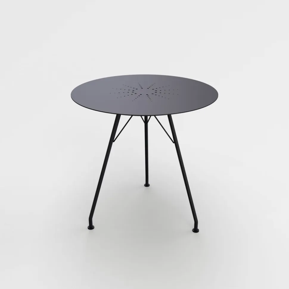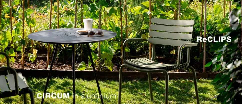 Der Circum Cafe-Tisch hat einen leichten und eleganten Look mit seinem dünnen Gestell und der Tischplatte aus pulverbeschichtetem Metall oder schlanken Holzlatten. Der Tisch hat die ideale Größe für kleine Outdoor-Ecken, wo er mit einem der Outdoor-Stühle von ergänzt werden kann.