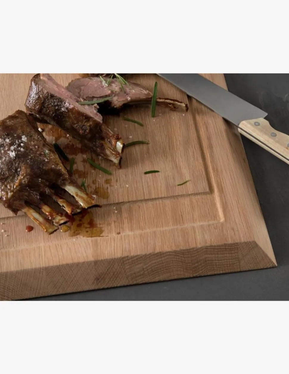 Diese drei schönen Schneidebretter sind Teil einer Serie von Schneide- und Servierbrettern aus massiver Eiche von . Jedes dieser Schneidebretter ist auf einzigartige Weise geschnitzt. Sie sind diagonal und haben einen Winkel von 45 Grad. Mit den drei unterschiedlich großen Schneidebrettern können Sie genau das Schneidebrett verwenden, das Ihren Bedürfnissen entspricht. Das große Modell ist ideal für klassische Aufgaben wie das Tranchieren von Weihnachtsenten und Schweinebraten. Deshalb verfügt das große Schneidebrett auch über eine Saftrille und ein Reservoir auf einer Seite, damit der Saft von z.B. Fleisch nicht auf dem Küchentisch landet. Der kleine hingegen wäre perfekt, um einen Apfel zu schneiden, Schokolade zu hacken usw.