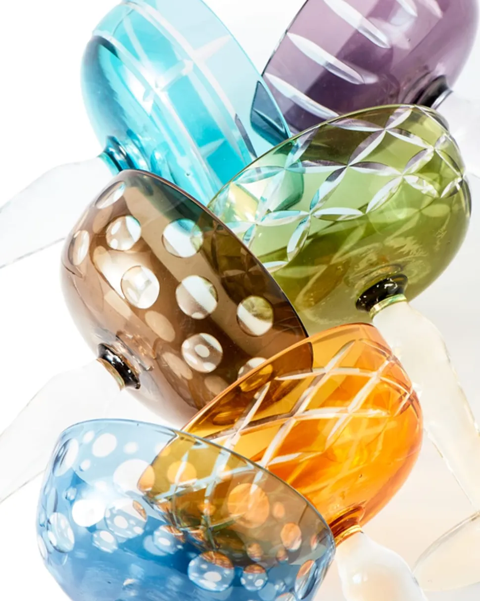 Die Cuttings Coupe Gläser von polspotten vereinen Eleganz und Charme in einem exklusiven Set aus farbenfrohen Gläsern, die jeweils mit einzigartigen, handgefertigten Schliffmustern verziert sind. Aus massivem Farbglas gefertigt, strahlen diese Coupe-Gläser Qualität und Charakter aus. Ihre individuellen Muster machen jedes Glas zu einem kleinen Kunstwerk, perfekt, um Farbe und Stil zu jedem Anlass zu bringen.