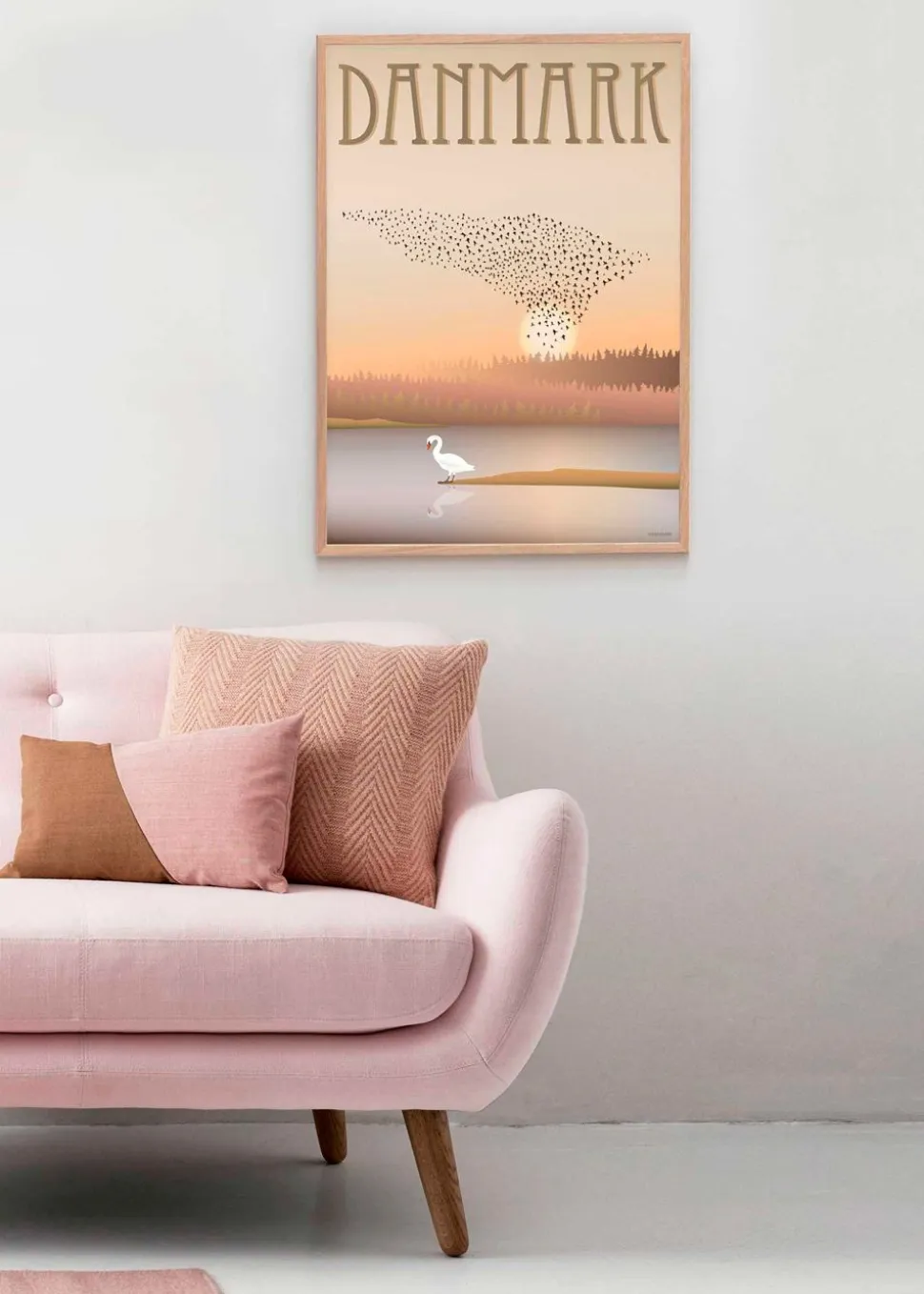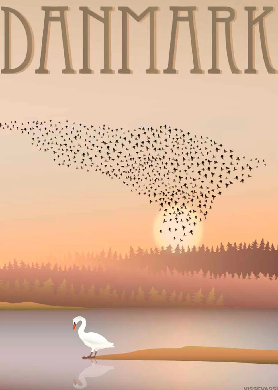 Wunderschönes Plakat von VisseVasse, aus seiner Sammlung Dänemark-Plakat. Um das Poster: Auf dem Black-Sun-Poster werden die schönen Stare gezeigt, die den Himmel schwarz malen, während sie in der Abenddämmerung tanzen.