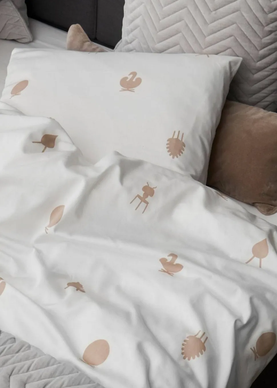 Die Grundfarbe der Bettwäsche ist weiß und verleiht Ihrem Zuhause ein helles und leichtes Aussehen. Die Bettwäsche ist mit sandfarbenen Design-Icons in einem schönen und harmonischen Muster verziert, das für einen ruhigen Look in Ihrem Schlafzimmer sorgt.