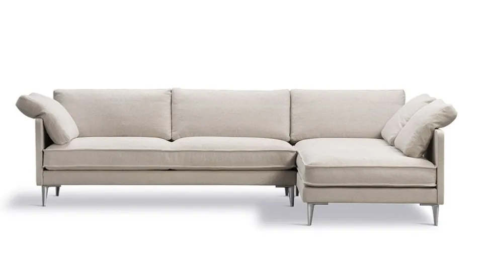 - Das Gestell ist entweder aus verchromtem oder dunkelgrauem Stahl. Sitz mit Holzblendrahmen, gepolstert mit Daunenschaumkern und Nozagfedern. Sofa und Kissen sind mit dem gewünschten Stoff gepolstert – nicht in Leder erhältlich.