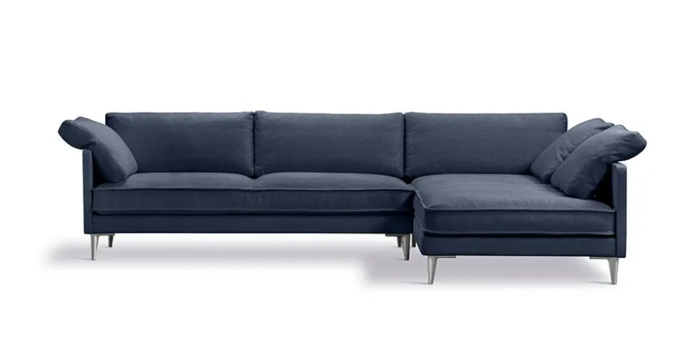 - Das Gestell ist entweder aus verchromtem oder dunkelgrauem Stahl. Sitz mit Holzblendrahmen, gepolstert mit Daunenschaumkern und Nozagfedern. Sofa und Kissen sind mit dem gewünschten Stoff gepolstert – nicht in Leder erhältlich.