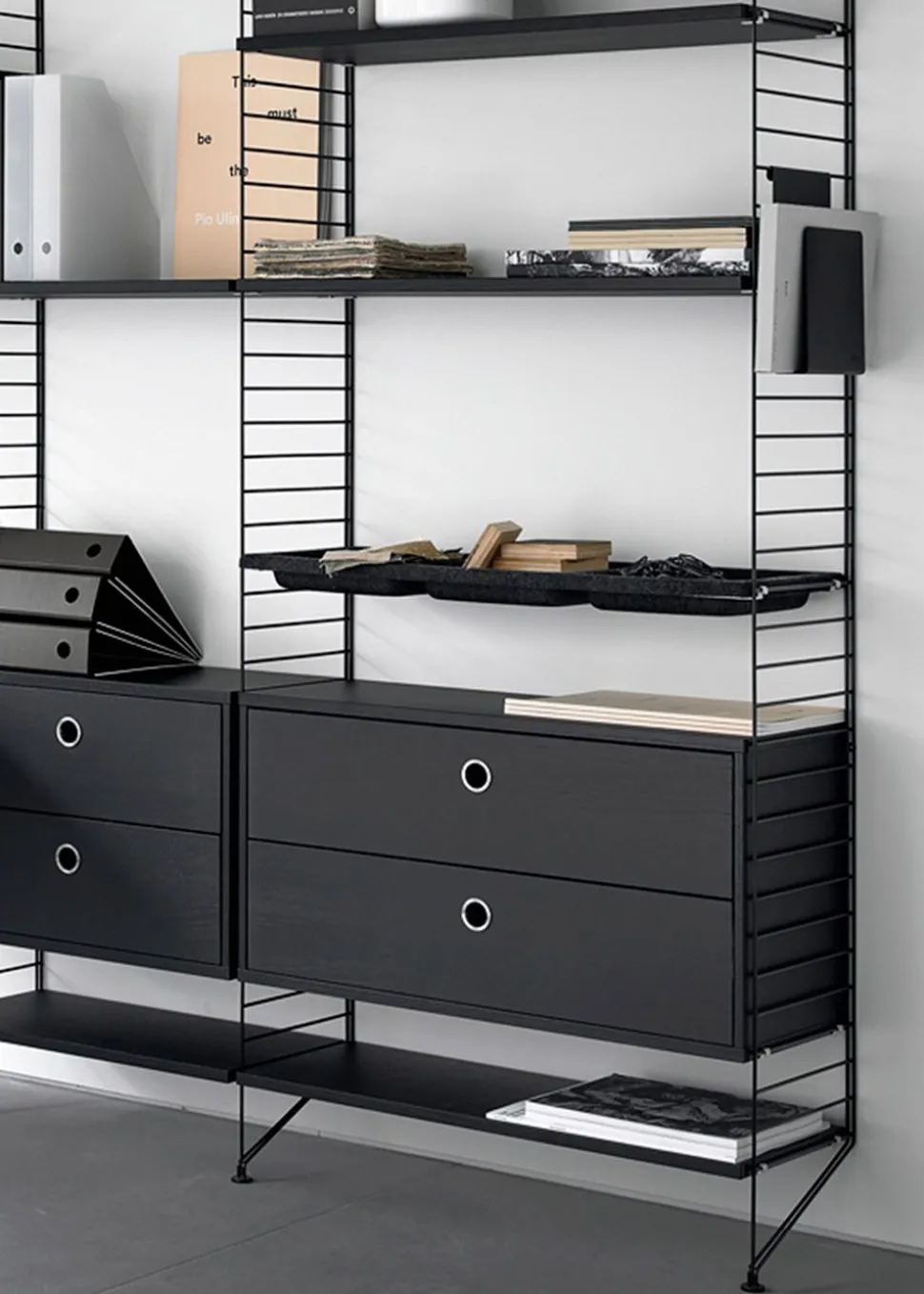 Das Filzschalenregal ist Teil des String-Regalsystems, bei dem Funktionalität und individuelle Gestaltung im Vordergrund stehen. Das Regalsystem bietet unendliche Möglichkeiten für die Aufbewahrung und Kreativität. Mit einer großen Auswahl an Varianten, Farben und Materialien ist das String-Regalsystem der perfekte Weg, um Ihr eigenes Design zu gestalten. Die Serie besteht aus Boden-, Wand- und Flex-Paneelen, die eine Basis für Regale und Ablagen bilden. Es können Regale, Schränke, Bordüren, Zeitschriftenhalter und verschiedene Gadgets hinzugefügt werden. Das flexible System eignet sich perfekt für das moderne Zuhause, in dem einige wenige Elemente die Grundlage für die Inneneinrichtung des gesamten Hauses bilden können und sich leicht an den jeweiligen Raum anpassen lassen, egal für welchen Zweck.