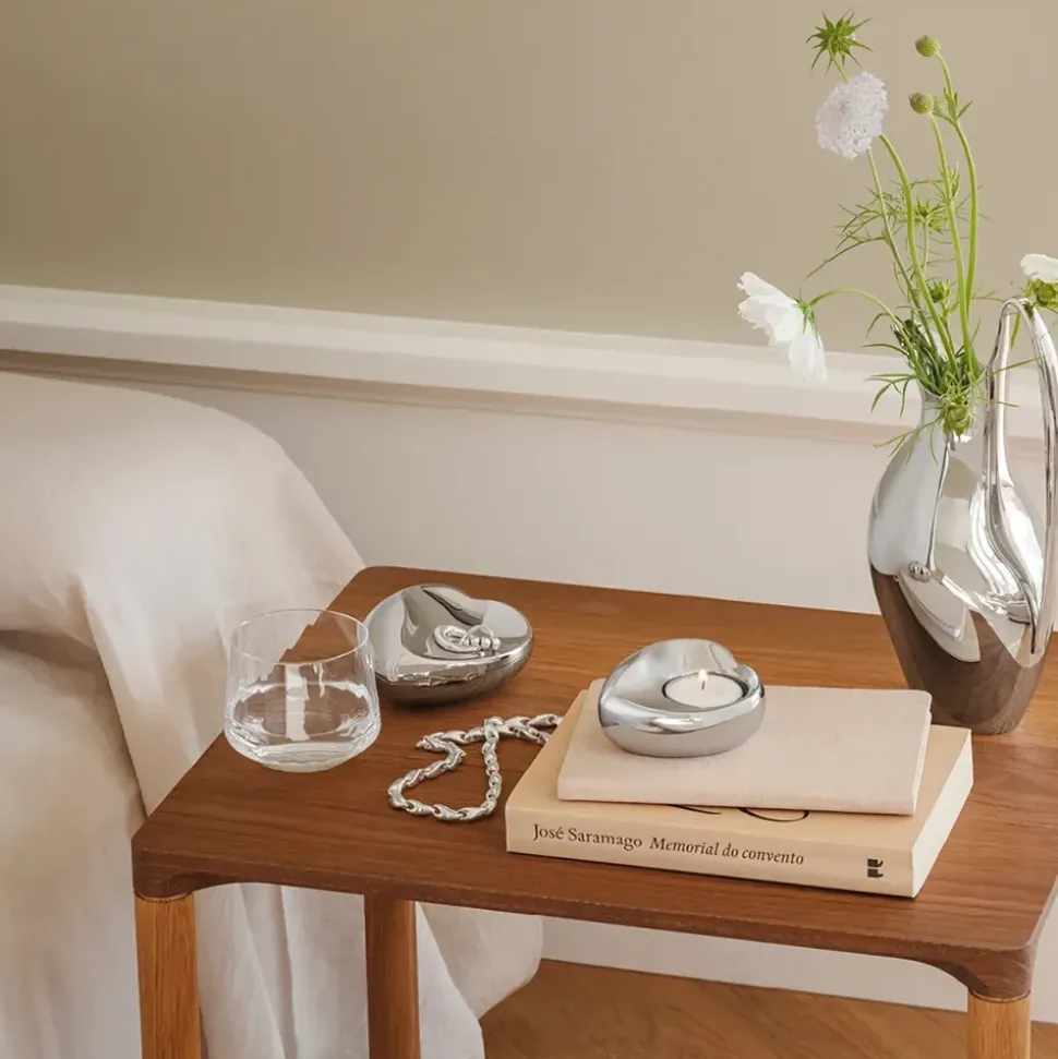Mit seiner herzförmigen Silhouette fängt dieser elegante Teelichthalter von Design Studio die Essenz von Romantik und raffiniertem Design ein. Das aus poliertem Edelstahl gefertigte Stück ist nicht nur eine Lichtquelle, sondern auch ein wahres Bekenntnis zur Handwerkskunst. Die glänzende Oberfläche fängt den sanften Schein der Kerze ein und reflektiert ihn, was jedem Raum eine warme und einladende Atmosphäre verleiht. Dieses einzigartige Design besteht aus zwei unterschiedlichen Hälften, die sich harmonisch umeinander legen und die Verschmelzung zweier Herzen symbolisieren.