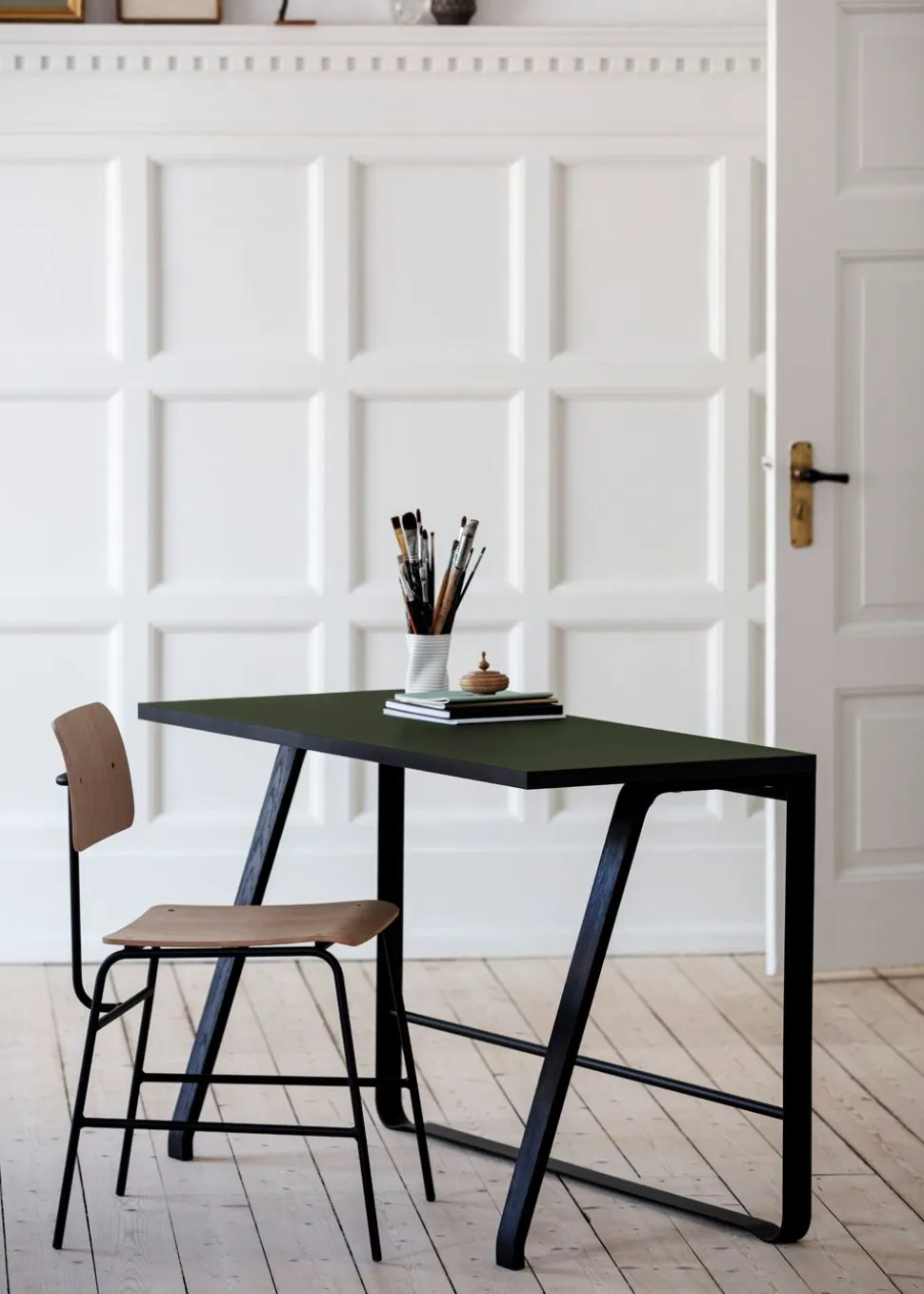 Hemingway wird von hergestellt. Der Schreibtisch ist klein und stilvoll und besteht aus einer Komposition aus Eiche und Stahl.