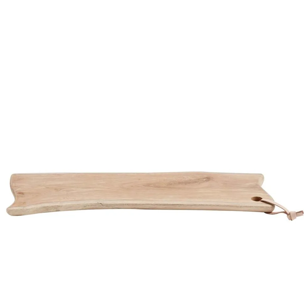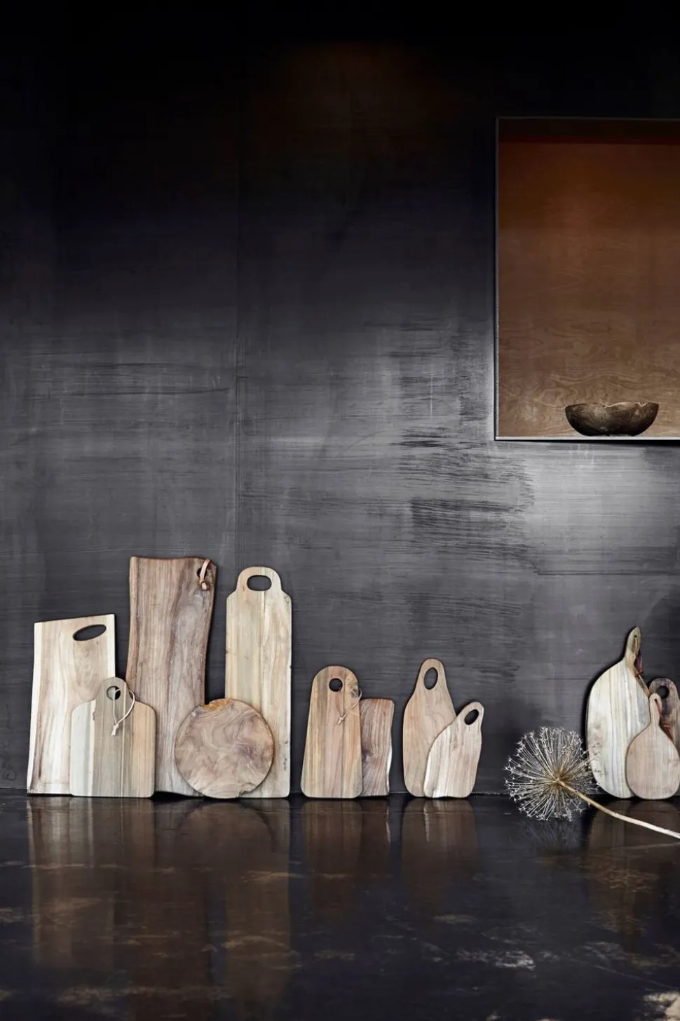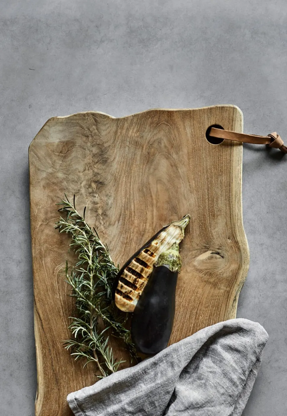 Lyon Schneidebrett, Muubs. Das organisch geformte Schneidebrett aus natürlichem Teakholz von Muubs ist ein ästhetisches Meisterwerk, bei dem die einzigartige Struktur und Form des Holzes die Grundlage für ein funktionelles Design bildet. Jedes Schneidebrett ist ein Unikat mit natürlichen Unebenheiten, Löchern und Details, die jedes Stück zu einem individuellen Kunstwerk machen. Das robuste Teakholz sorgt für Langlebigkeit, während der natürliche Charme einen unvergleichlichen visuellen Reiz schafft.