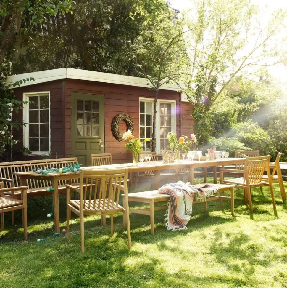 Die Bank kann als Sitzplatz am Esstisch oder freistehend in einer gemütlichen Ecke verwendet werden. Sie eignet sich auch als Chip, wenn es Zeit für ein kleines Nickerchen ist. Verwenden Sie die Bank allein als freistehendes Terrassenmöbel oder als Paar für einen persönlichen Look.