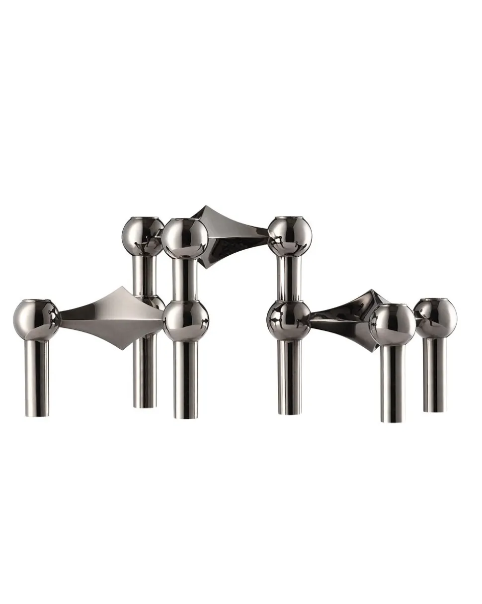 Der Nagel Kerzenhalter ist ein zeitloser Klassiker, der Kunst und Funktionalität zu einer skulpturalen Einheit verschmilzt. Entworfen von Werner Stoff in Zusammenarbeit mit Hans Nagel im Jahr 1965, strahlt dieser ikonische Kerzenhalter modernistische Eleganz und Individualität aus. Mit seinen drei Stangen und der stromlinienförmigen Chromoberfläche bringt er einen Hauch von Designästhetik aus der Mitte des Jahrhunderts in jedes Zuhause. Die modulare Konstruktion ermöglicht es Ihnen, mehrere Nagel-Kerzenhalter zu kombinieren und individuell zu gestalten, um Ihre eigene persönliche Skulptur zu schaffen – mit oder ohne Kerzen. Eine perfekte Kombination aus Form und Funktion, die Ihre Inneneinrichtung auf ein neues Niveau hebt.