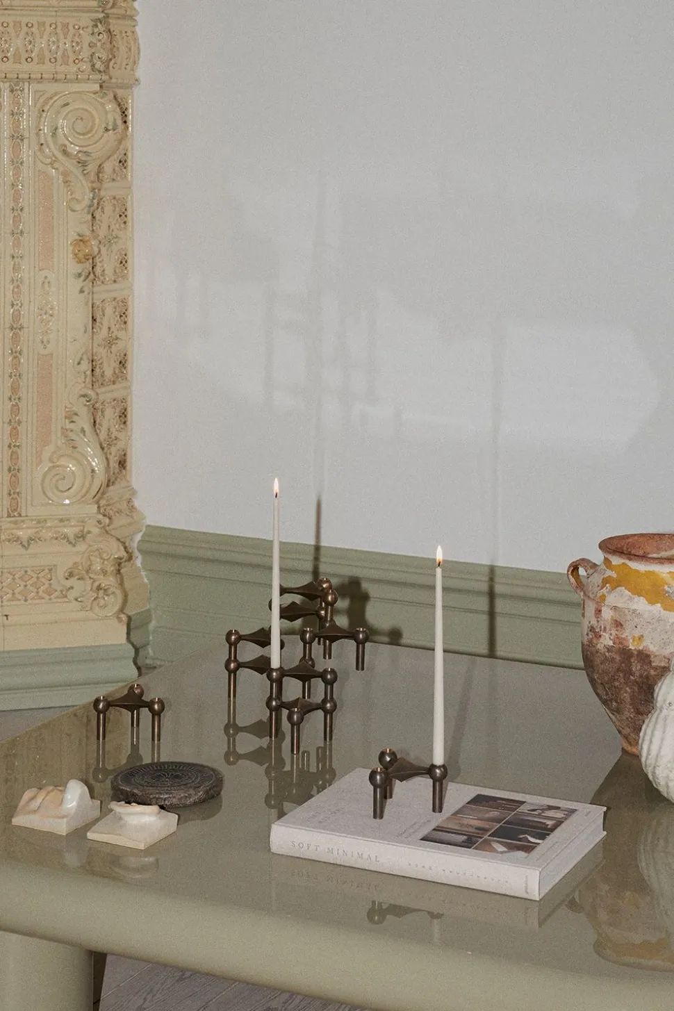 Der Nagel Kerzenhalter ist ein zeitloser Klassiker, der Kunst und Funktionalität zu einer skulpturalen Einheit verschmilzt. Entworfen von Werner Stoff in Zusammenarbeit mit Hans Nagel im Jahr 1965, strahlt dieser ikonische Kerzenhalter modernistische Eleganz und Individualität aus. Mit seinen drei Stangen und der stromlinienförmigen Chromoberfläche bringt er einen Hauch von Designästhetik aus der Mitte des Jahrhunderts in jedes Zuhause. Die modulare Konstruktion ermöglicht es Ihnen, mehrere Nagel-Kerzenhalter zu kombinieren und individuell zu gestalten, um Ihre eigene persönliche Skulptur zu schaffen – mit oder ohne Kerzen. Eine perfekte Kombination aus Form und Funktion, die Ihre Inneneinrichtung auf ein neues Niveau hebt.