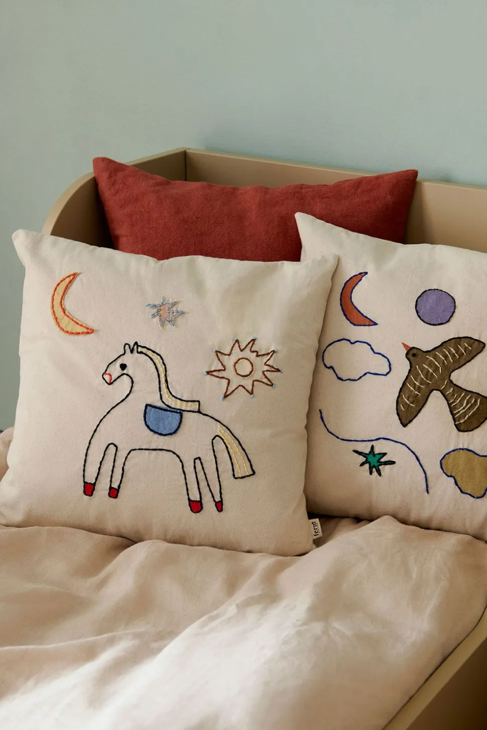 - Material: Handgestickt aus 100% ungefärbter GOTS-zertifizierter Bio-Baumwolle mit Stickerei, Federn- und Daunenfüllung.