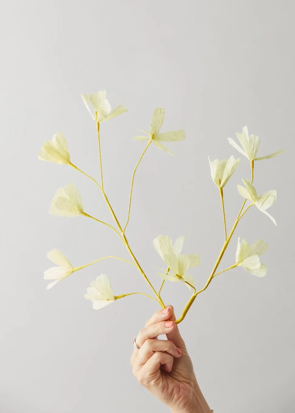 Die Papierblume Branch Grande von ist eine bezaubernde Papierblume, inspiriert von Oxalis vulcanicola – rotem Sauerklee. Roter Sauerklee ist bekannt für seine kleinen herzförmigen Blätter und seine rötlich-violette Farbe.