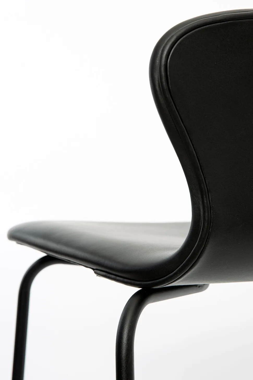 Material: Die Schale ist aus 12 mm FSC-zertifiziertem Buchenfurnier gefertigt. Sie ist mit 20 mm Kaltschaum ausgekleidet, der Öko-Tex-zertifiziert ist und für einen angenehmen Sitzkomfort sorgt. Der Stuhlbezug besteht aus geschütztem Leder, ebenfalls Öko-Tex-zertifiziert. Er hat eine glatte und polierte Oberfläche mit einer dezenten, feinen Druckstruktur. Das Leder ist wasserabweisend, schmutzabweisend, schmutzabweisend, langlebig und leicht zu pflegen.