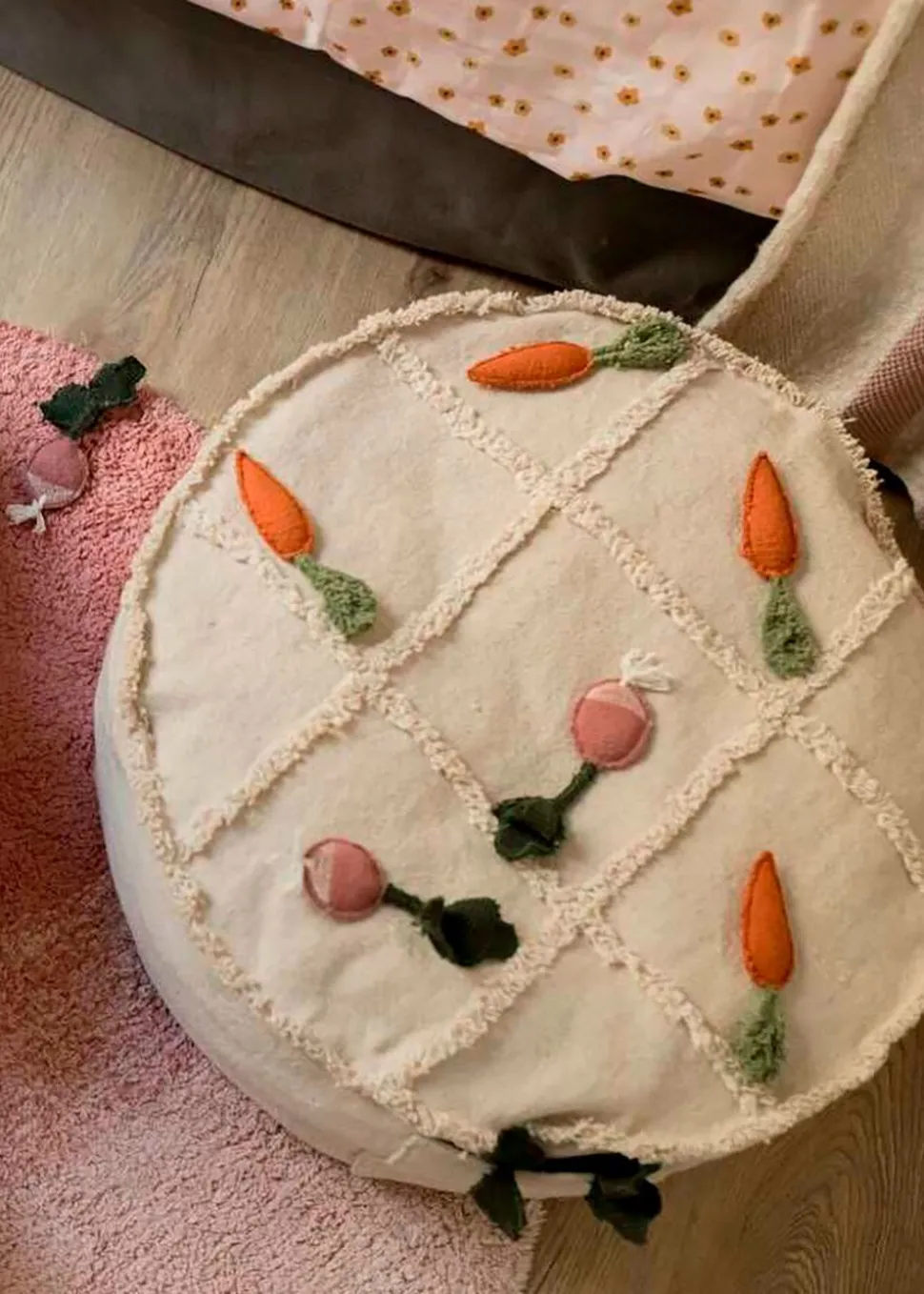 Die Spielfiguren, die aus 4 kleinen Karotten und 4 Radieschen bestehen, lassen sich schnell und einfach in den kleinen Taschen auf jeder Seite des Puffs verstauen. Wenn es Zeit ist, das Spiel zu beginnen, setzt man die Spielsteine abwechselnd auf die Spielfeldlinien, die auf der Oberseite des Puffs zu sehen sind.
