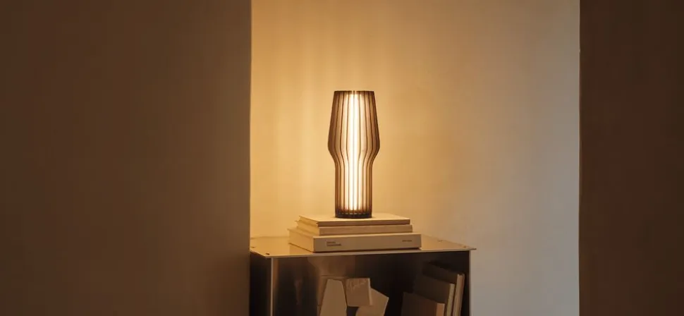 Die Lampe Radiant von schafft Gemütlichkeit. Sie können ihn an einem Spätsommerabend auf der Terrasse oder im Wohnzimmer aufstellen, um eine einzigartige Atmosphäre zu schaffen. Das rohe Eichenholz lässt den Raum stilvoll wirken. Die Lampe verfügt über eine Taste an der Oberseite, mit der Sie die Helligkeit einstellen können. Mit einer Akkuladung kann sie bis zu 33 Stunden lang Strom liefern und leuchten.