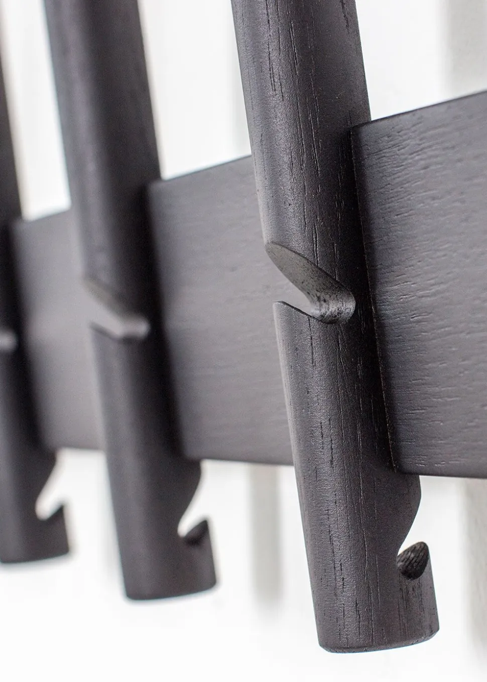 Der Reces – Large von ist ein schönes und optisch ansprechendes Stück Inneneinrichtung, das gleichzeitig als geräumiger Kleiderständer dient. Die vertikalen Kleiderbügel aus Eichenholz mit kleinen Aussparungen ermöglichen es, dass jeder Haken mehrere Kleidungsstücke und andere Gegenstände aufnehmen kann – ohne dass es zu eng oder unübersichtlich wird.