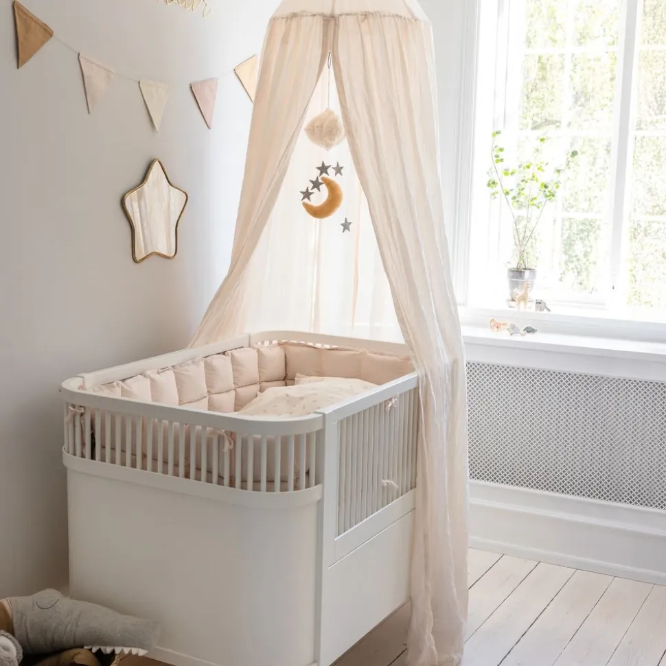 Der Betthimmel von ist ein Traum aus Weichheit und Eleganz für das Kinderzimmer. Gefertigt aus zertifizierter Bio-Baumwolle in exklusiver Schaftweberei, vereint er schönes Design und Funktionalität. Das leichte Material sorgt für eine optimale Luftzirkulation, damit Ihr Kind sicher und bequem schlafen kann. Mit einem dezenten Metallbügel und der Möglichkeit, ein Mobile aufzuhängen, schafft es eine besonders gemütliche Atmosphäre.