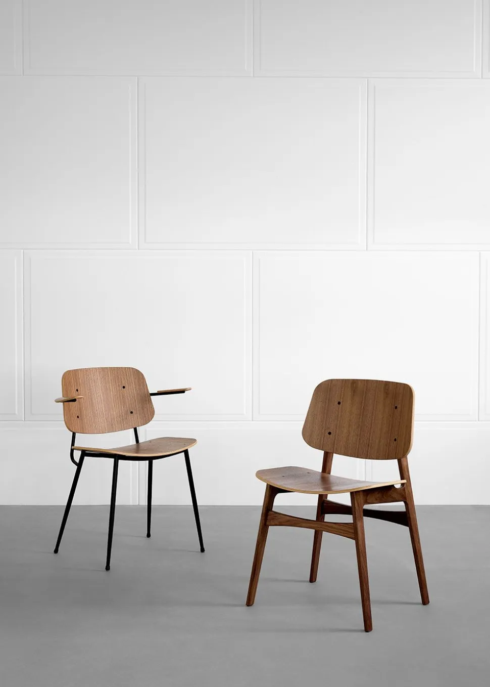 Die Serie „Søborg“ markiert einen Moment in der Geschichte der dänischen Möbelarchitektur, in dem Design und moderne Techniken kulminieren und neue Dimensionen des Tischlerhandwerks eröffnen. Der Stuhl ist das Ergebnis einer Reise zu MoMa’s internationalem Designwettbewerb „Low-Cost Furniture“ im Jahr 1948, bei dem der Designer Børge Mogensen das geformte Furnier kennenlernte. 1950 wurde der Søborg-Stuhl ein Produkt dieser neuen Technologie, und ohne die charakteristische Liebe zur Tradition aufzugeben, wurde der Sitz aus geformtem Furnier mit einem Gestell aus Massivholz kombiniert. Weiche Formen interagieren mit einem nonchalanten Ausdruck, der je nach Blickwinkel des Betrachters schlank oder voll wirkt. Mit ihren durchdachten Proportionen, die für ein komfortables Sitzerlebnis sorgen, sind die „Søborg“-Stühle ein Klassiker sowohl für das moderne als auch für das traditionelle Zuhause.