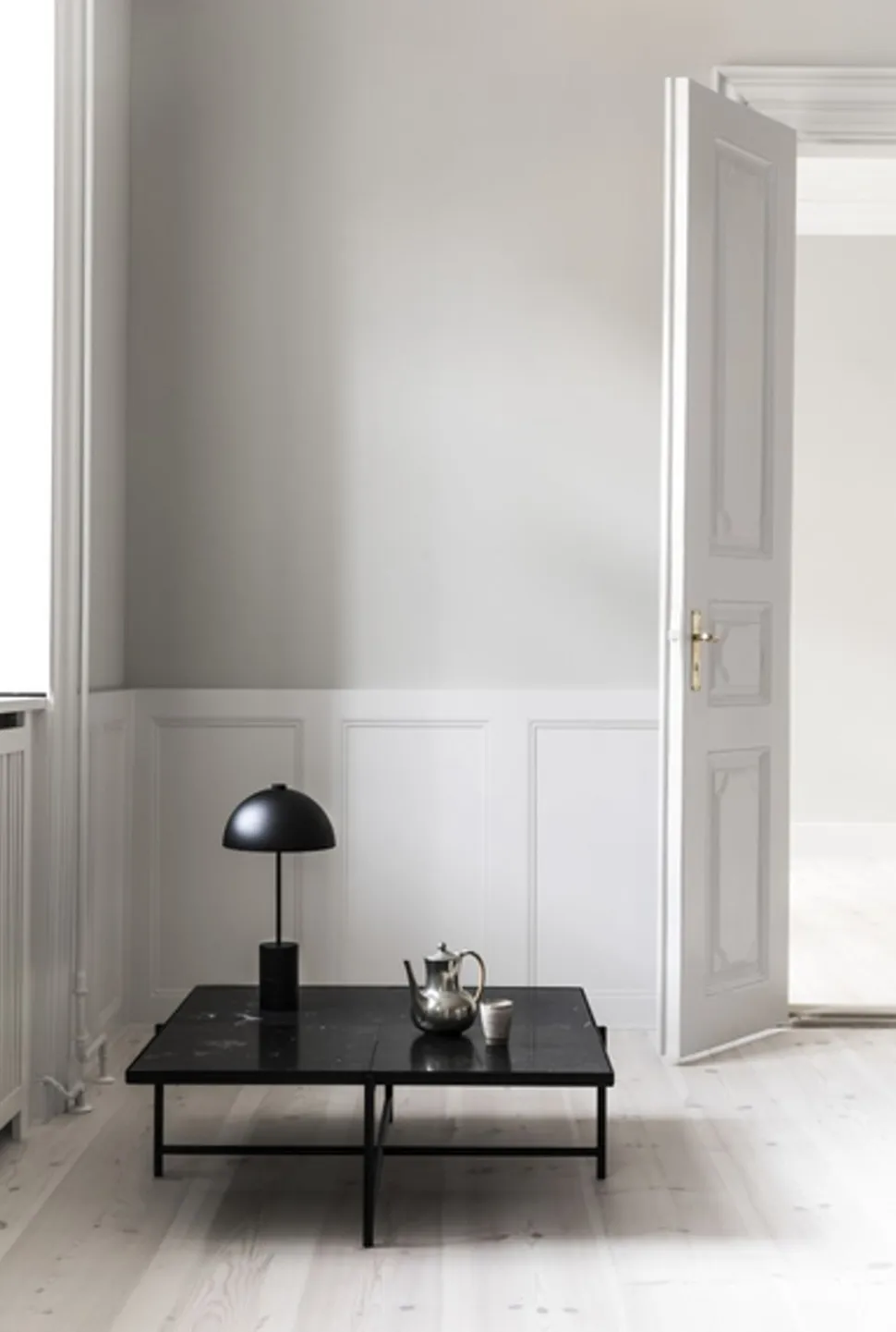 Studio-Tischleuchten sind aus schwarz pulverbeschichtetem Stahl gefertigt. Die Messingdetails sind aus massivem Messing und naturbelassen.