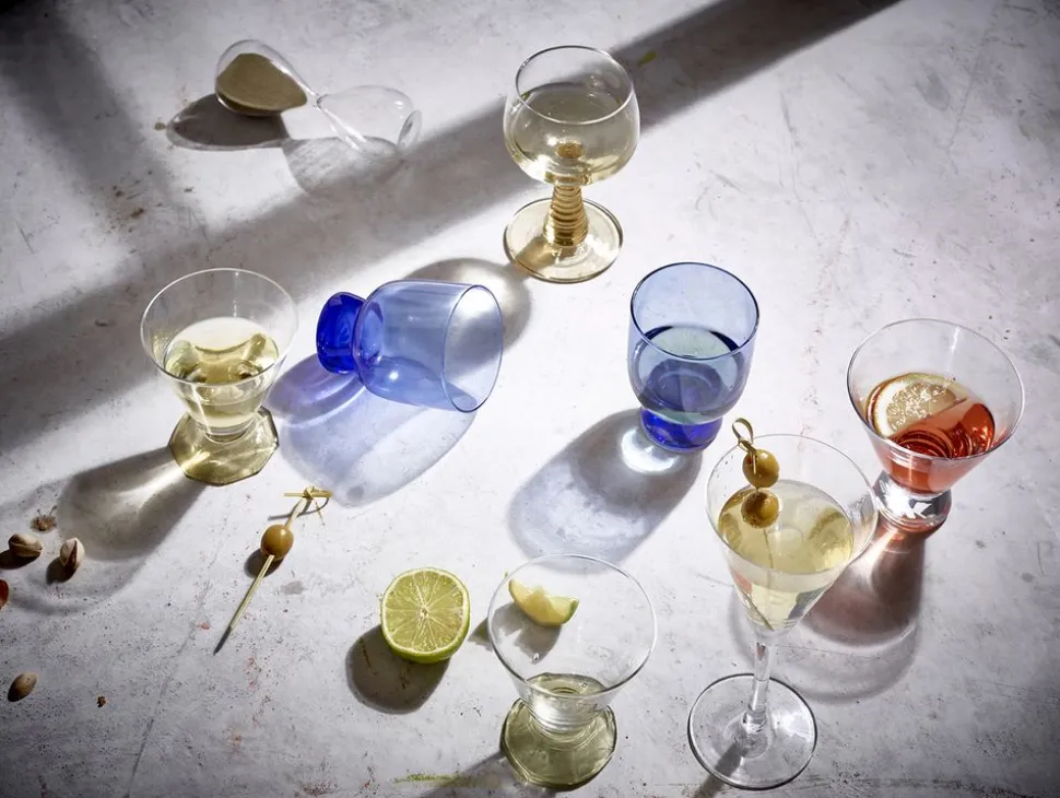 Schöne verschiedenfarbige Weingläser mit einem schönen Design im Boden, das das Weinglas zu etwas Besonderem macht. Das Glas ist mundgeblasen und hat einen massiven Glasboden mit verschiedenen Farben. Bieten Sie Ihren Gästen ein Glas Wein in diesem Glas an und der Tisch sieht mit einem einzigartigen Weinglas schöner aus als mit einem herkömmlichen Weinglas. Das Weinglas ist sowohl spülmaschinenfest als auch lebensmittelecht.