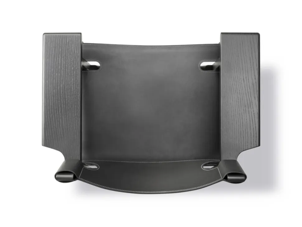 Der Sessel ist mit einem stabilen Holzrahmen aus Massivholz konstruiert, der mit seiner geringen Höhe für das beliebte Lounge-Feeling sorgt, das der Sessel ausstrahlt. Die breiten Armlehnen bieten nicht nur Komfort, sondern auch eine zusätzliche funktionale Dimension, da sie sich ideal als Beistelltisch, für eine Tasse oder ein Buch eignen. Dieses Detail macht den Stuhl zu einem Möbelstück, das für sich allein im Raum stehen kann und eine informellere Gesprächsatmosphäre eröffnet. Sitz und Rückenlehne sind aus schwerem Kernleder gefertigt und mit sichtbaren Messingschnallen verschlossen, so dass der Betrachter die gesamte Konstruktion des Möbelstücks sehen kann, ohne die außergewöhnlichen Details zu verbergen.