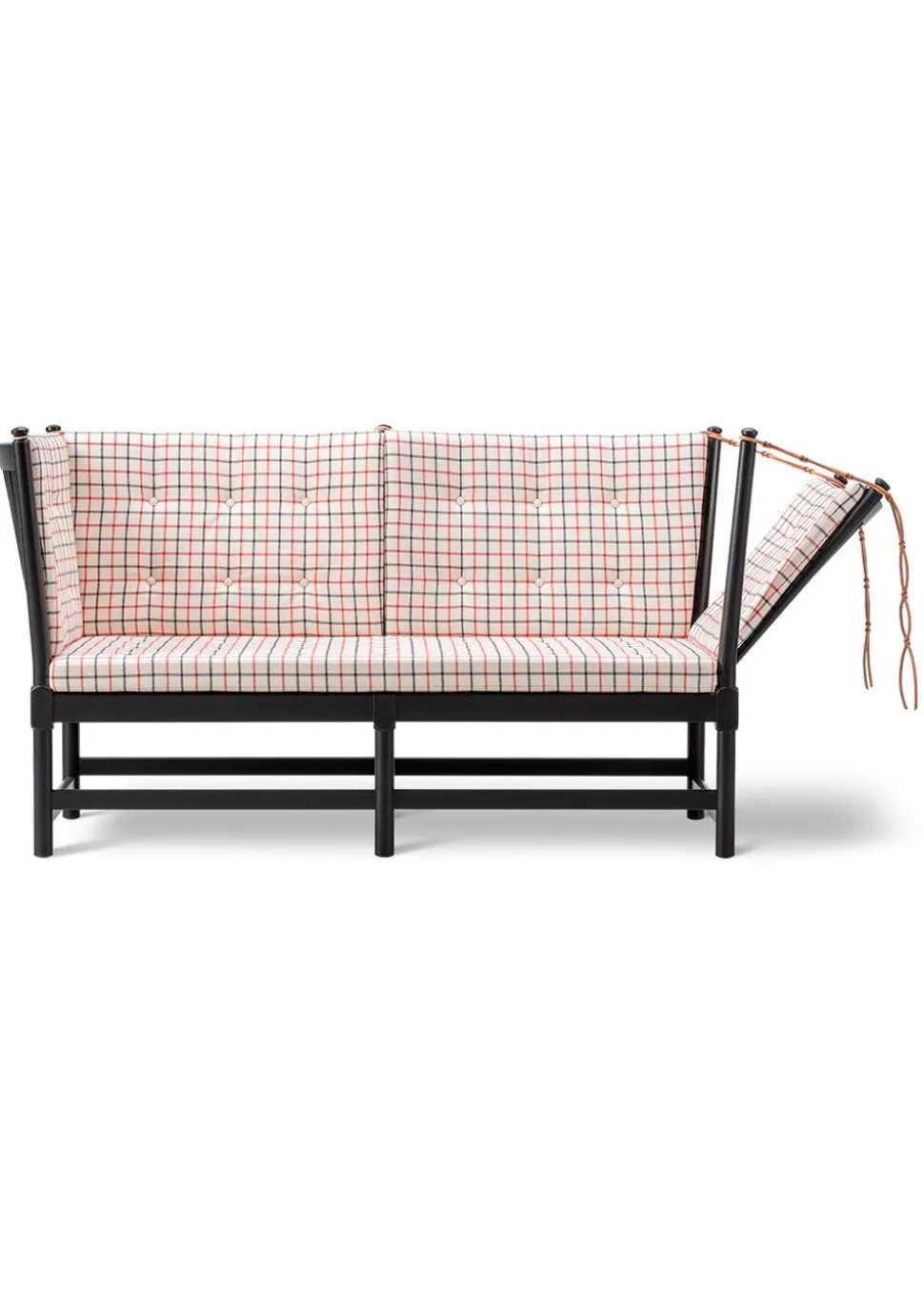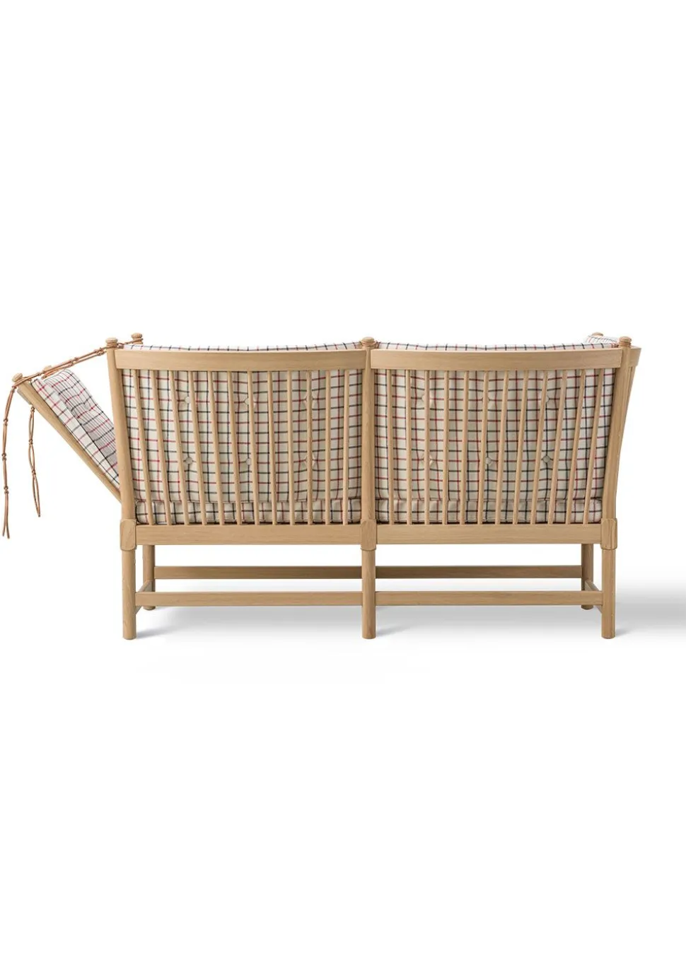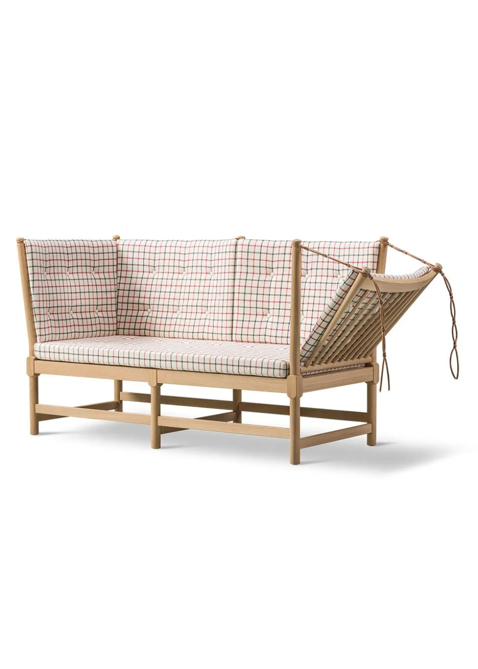 Das ikonische Möbelstück hat seinen Status aufgrund seines bahnbrechenden Designs erlangt, das auf elegante Weise die Ideen des englischen Daybeds und der französischen Chaiselongue vereint. Børge Mogensen hat den Komfort dieses Möbels in einer flexiblen Armlehne nachgebildet, die über charakteristische Lederriemen, die auf die Farbe des jeweiligen Möbelstücks abgestimmt sind, im Winkel verstellt werden kann. Dies eröffnete eine völlig neue Dimension des flexiblen Komforts, der zu einem der wichtigsten Werte des beliebten Designers geworden ist. Die Funktionalität der Möbel wurde mit einem traditionellen dänischen Design kombiniert, das, charakteristisch für Mogensens Design, das Holz als tragendes Material der Möbel einbezieht. Der optische Holzrahmen bildet den Rahmen für die eleganten Kissen, die durch Knöpfe ergänzt werden, die dem Kissen zusätzliches Volumen verleihen. Das Sofa ist in der ikonischen Textilie Cotil erhältlich, die mit ihren charakteristischen Karos und traditionellen Farben dazu beiträgt, den ursprünglichen Geist des Möbels zu erhalten, und die perfekt zum behandelten Holz passt.