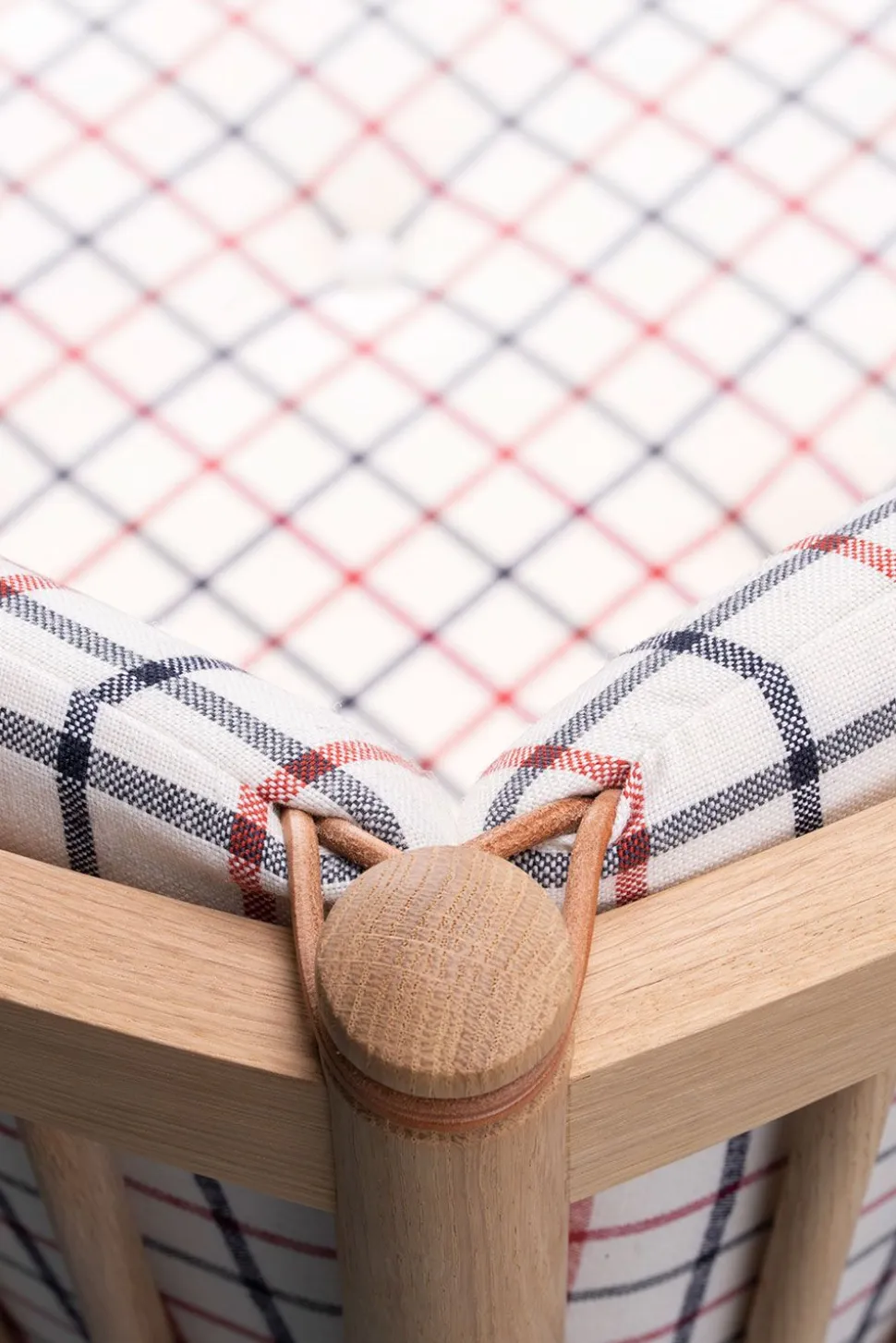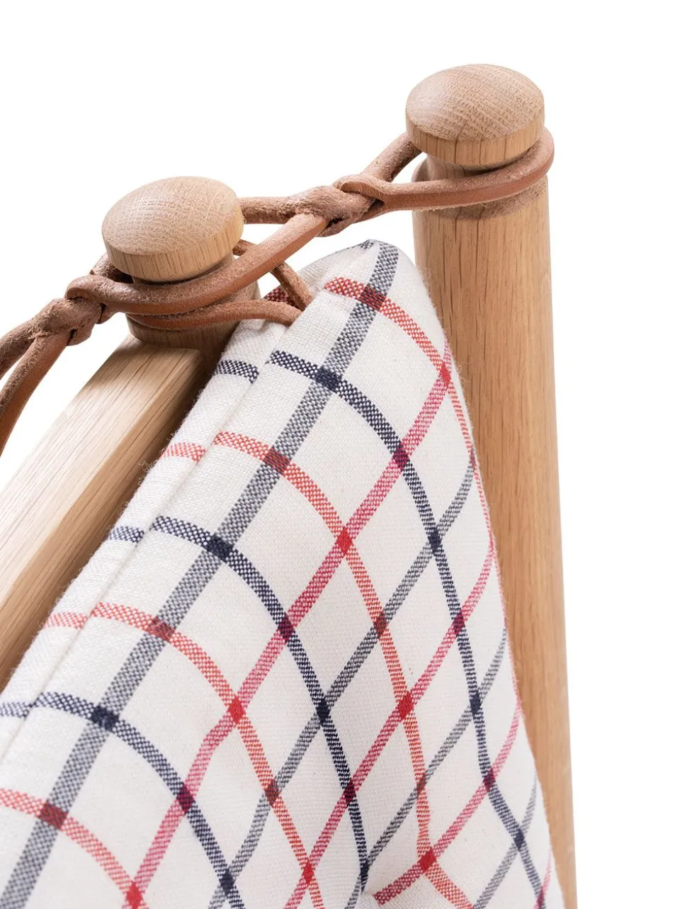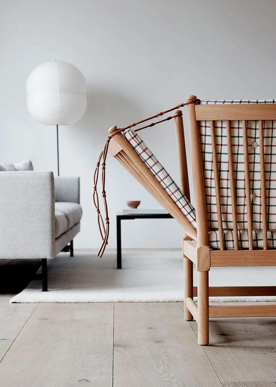 Das ikonische Möbelstück hat seinen Status aufgrund seines bahnbrechenden Designs erlangt, das auf elegante Weise die Ideen des englischen Daybeds und der französischen Chaiselongue vereint. Børge Mogensen hat den Komfort dieses Möbels in einer flexiblen Armlehne nachgebildet, die über charakteristische Lederriemen, die auf die Farbe des jeweiligen Möbelstücks abgestimmt sind, im Winkel verstellt werden kann. Dies eröffnete eine völlig neue Dimension des flexiblen Komforts, der zu einem der wichtigsten Werte des beliebten Designers geworden ist. Die Funktionalität der Möbel wurde mit einem traditionellen dänischen Design kombiniert, das, charakteristisch für Mogensens Design, das Holz als tragendes Material der Möbel einbezieht. Der optische Holzrahmen bildet den Rahmen für die eleganten Kissen, die durch Knöpfe ergänzt werden, die dem Kissen zusätzliches Volumen verleihen. Das Sofa ist in der ikonischen Textilie Cotil erhältlich, die mit ihren charakteristischen Karos und traditionellen Farben dazu beiträgt, den ursprünglichen Geist des Möbels zu erhalten, und die perfekt zum behandelten Holz passt.