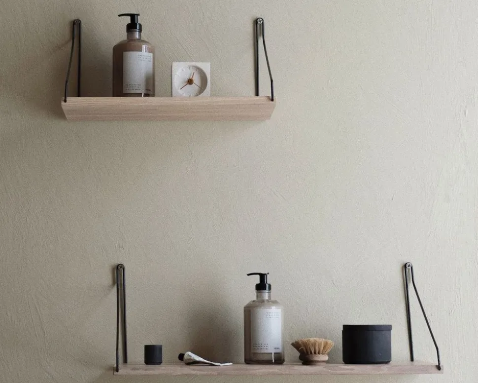 Wirklich schönes und klassisches Regal der dänischen Designermarke cph. Das Regal ist von den Modellen aus den 50er Jahren inspiriert und hat einen köstlichen und Vintage-ähnlichen Look, aber dennoch modern und trendy im Ausdruck. Das Material ist weiß geölte Eiche mit Stäben aus Messing oder schwarz, die Sie bei der Bestellung auswählen müssen. Das Regal kann fast überall hängen. Zum Beispiel in der Küche für Gewürze und Öle, im Wohnzimmer mit Büchern und Dekorationen oder im Schlafzimmer oder in den Gängen. Nur die Phantasie setzt die Grenzen.