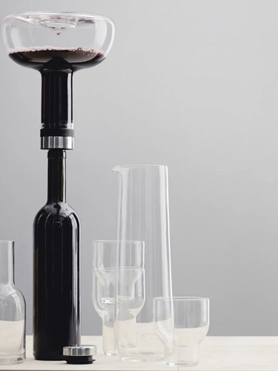 Wine Breather ist von und wurde von Norm Architects entworfen. Die Flasche ist aus mundgeblasenem Glas, aber auch in Rauchglas erhältlich. Die Farbe trägt zum klaren, modernen Look der Flasche bei, ein schönes Design. Wenn Sie eine Flasche Wein öffnen, können Sie sie noch einmal umdrehen, damit Sie den Wein für Originalflaschen vergessen können. Zusätzlich schmecken Sie die Vorteile des 10-fachen Sauerstoffs, des so genannten Vin Breather.