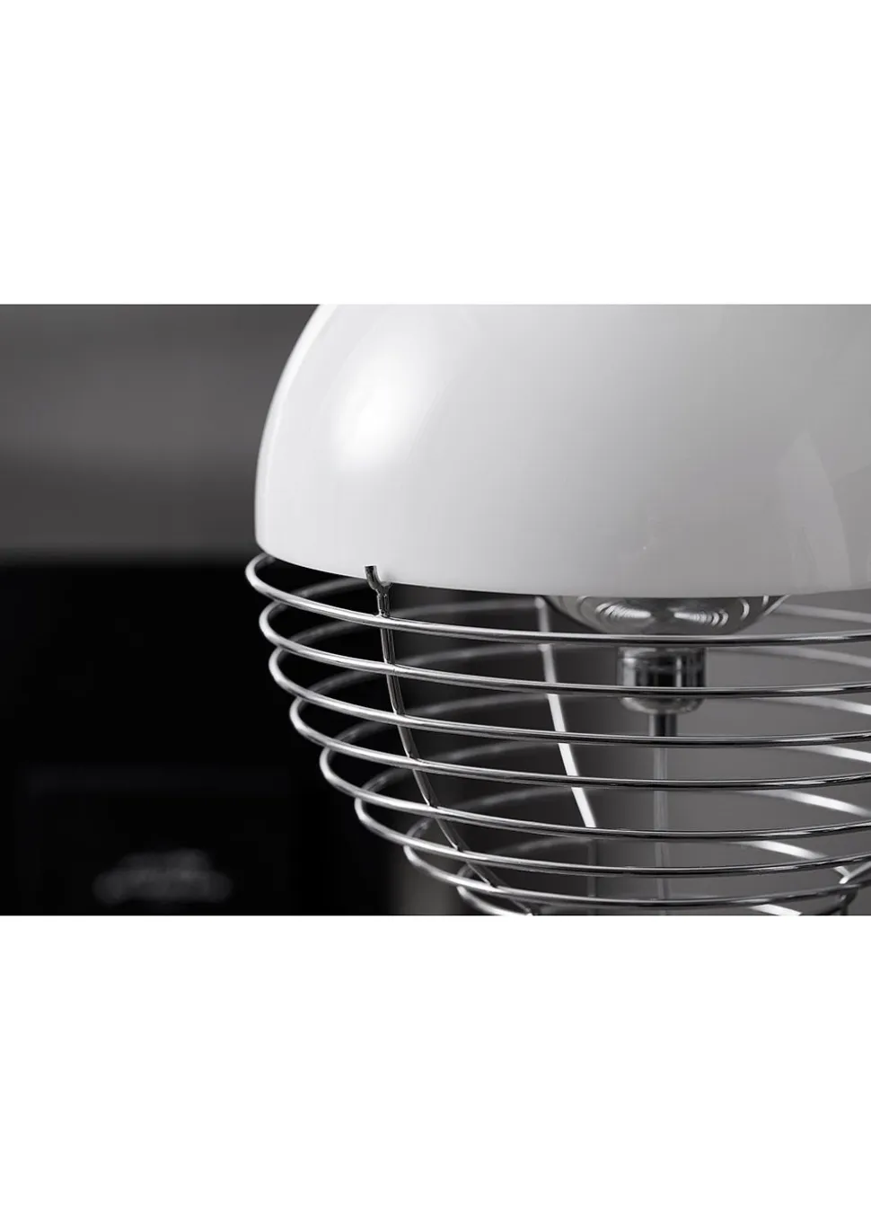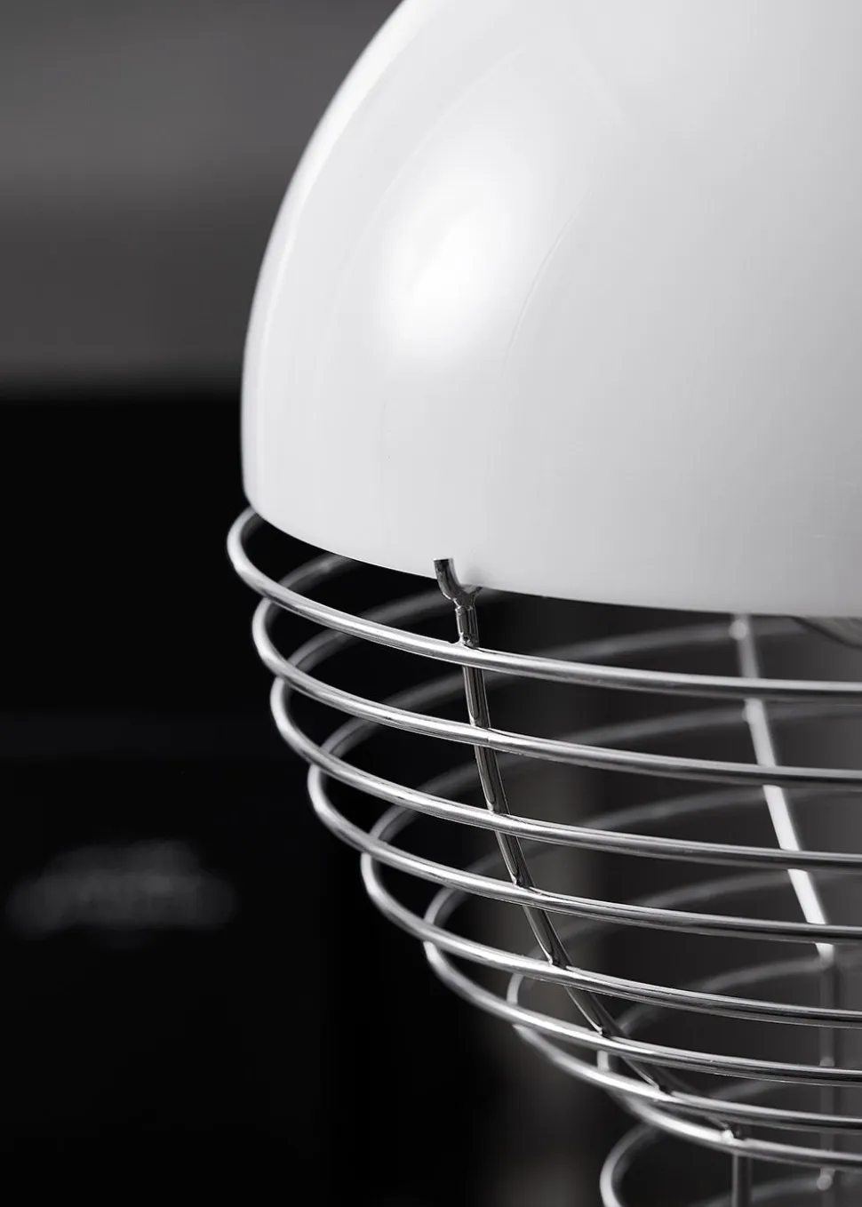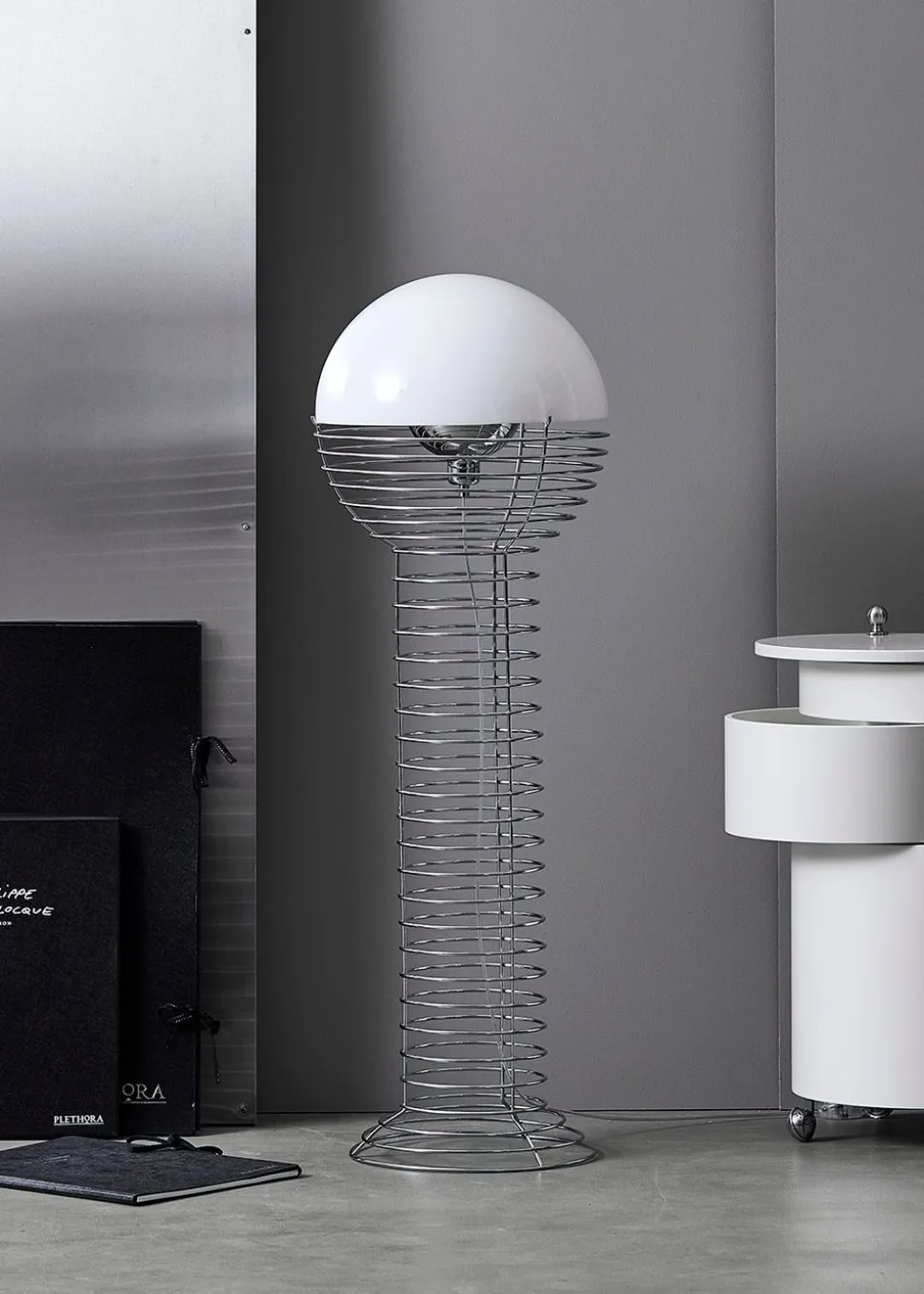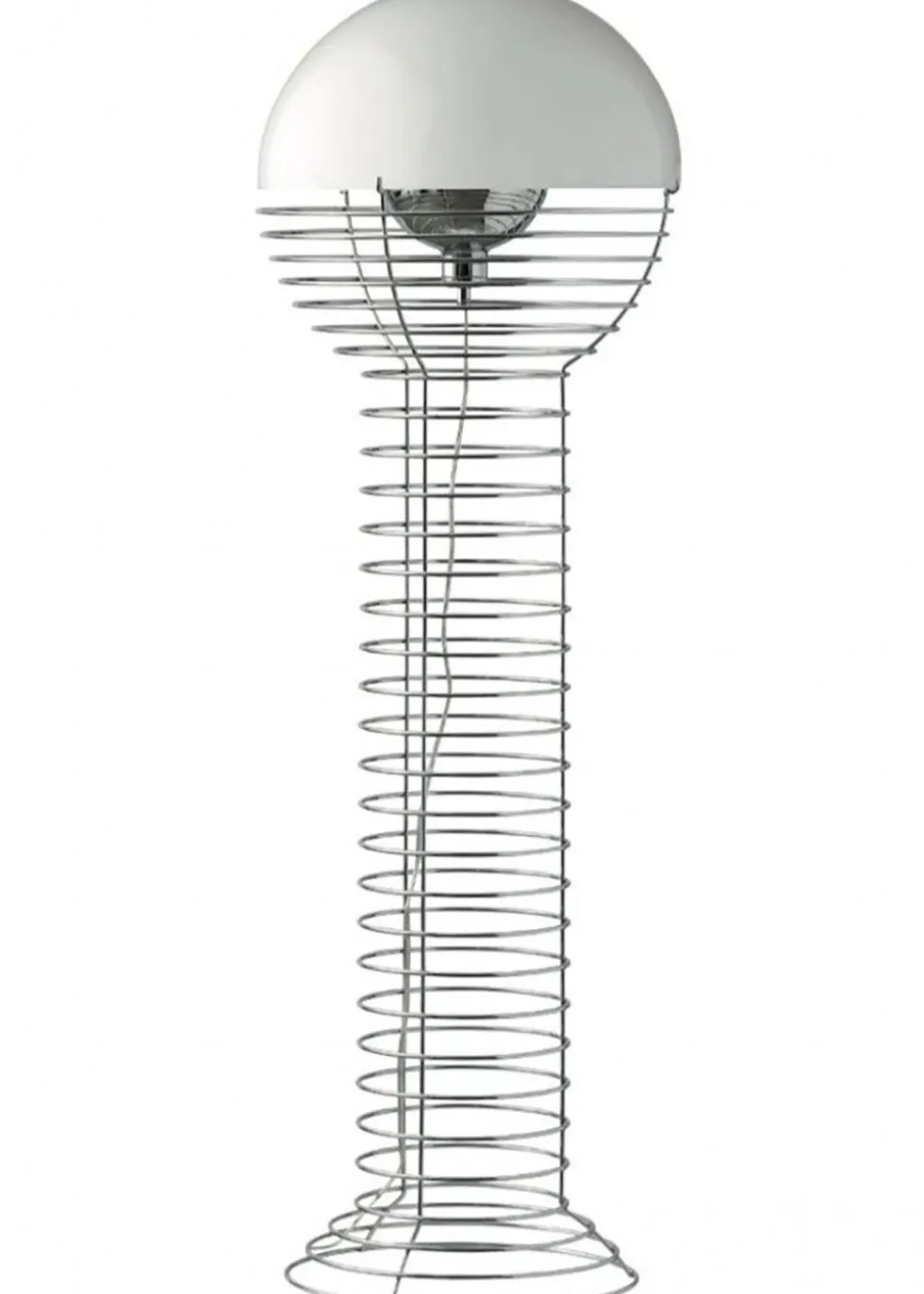 Die Draht-Stehleuchte wurde 1980 von Verner Planton entworfen. Der Rahmen hat eine zylindrische Form, die sich oben in eine Halbkugel ausdehnt. Der Rahmen ist aus verchromtem Stahl und der Lampenschirm aus Kunststoff.