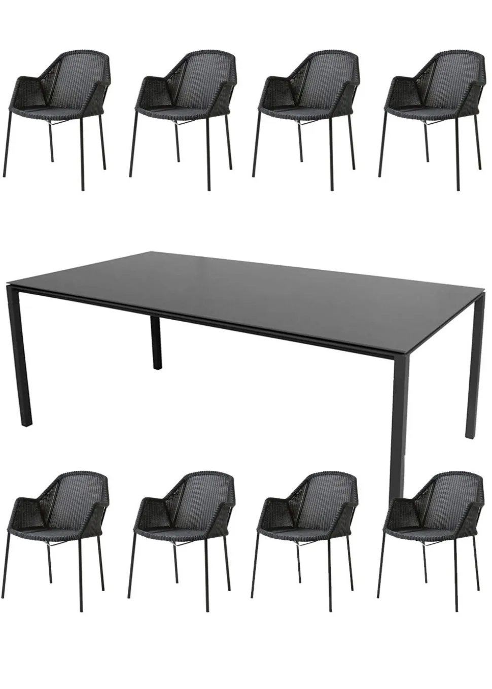 HINWEIS: Dieses Set enthält 8 Stühle Breeze (B: 60 X T: 62 X H: 83 X SH: 45 CM) und 1 Tisch Pure mit niedrigem grauem Gestell und schwarzer Keramikplatte (B: 280 X T: 100 X H: 73 CM)