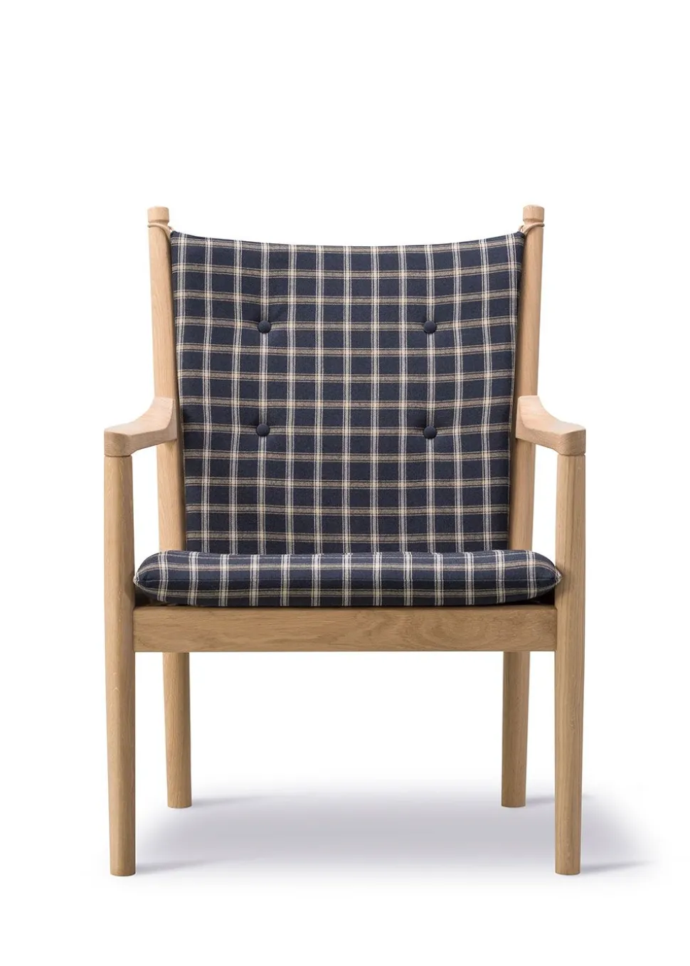 Der Sessel hat nicht nur den Status des „Tremmesofaens“ erlangt, sondern auch den Weg auf den internationalen Markt gefunden. Der Stuhl imitiert einige Merkmale des Tremmesofaen“, ist aber vor allem dafür bekannt, dass er den skulpturalen Aspekt von Wegners Design repräsentiert. Der Sitz hat einen leichten Winkel, der den Komfort eines Sessels bietet und gleichzeitig ein formelles und schönes Profil aufweist. Der Komfort des Stuhls wurde mit einem traditionellen dänischen Design kombiniert, das, charakteristisch für das Design der Zeit, das Holz als tragendes Material des Möbels einbezog. Der optische Holzrahmen bildet den Rahmen für die eleganten Kissen, die durch Knöpfe ergänzt werden, die dem Kissen zusätzliches Volumen verleihen. Der Sessel ist in der ikonischen Textilie Cotil erhältlich, die mit ihren charakteristischen Karos und traditionellen Farben dazu beiträgt, den ursprünglichen Geist des Möbels zu bewahren, und die perfekt zum behandelten Holz passt.