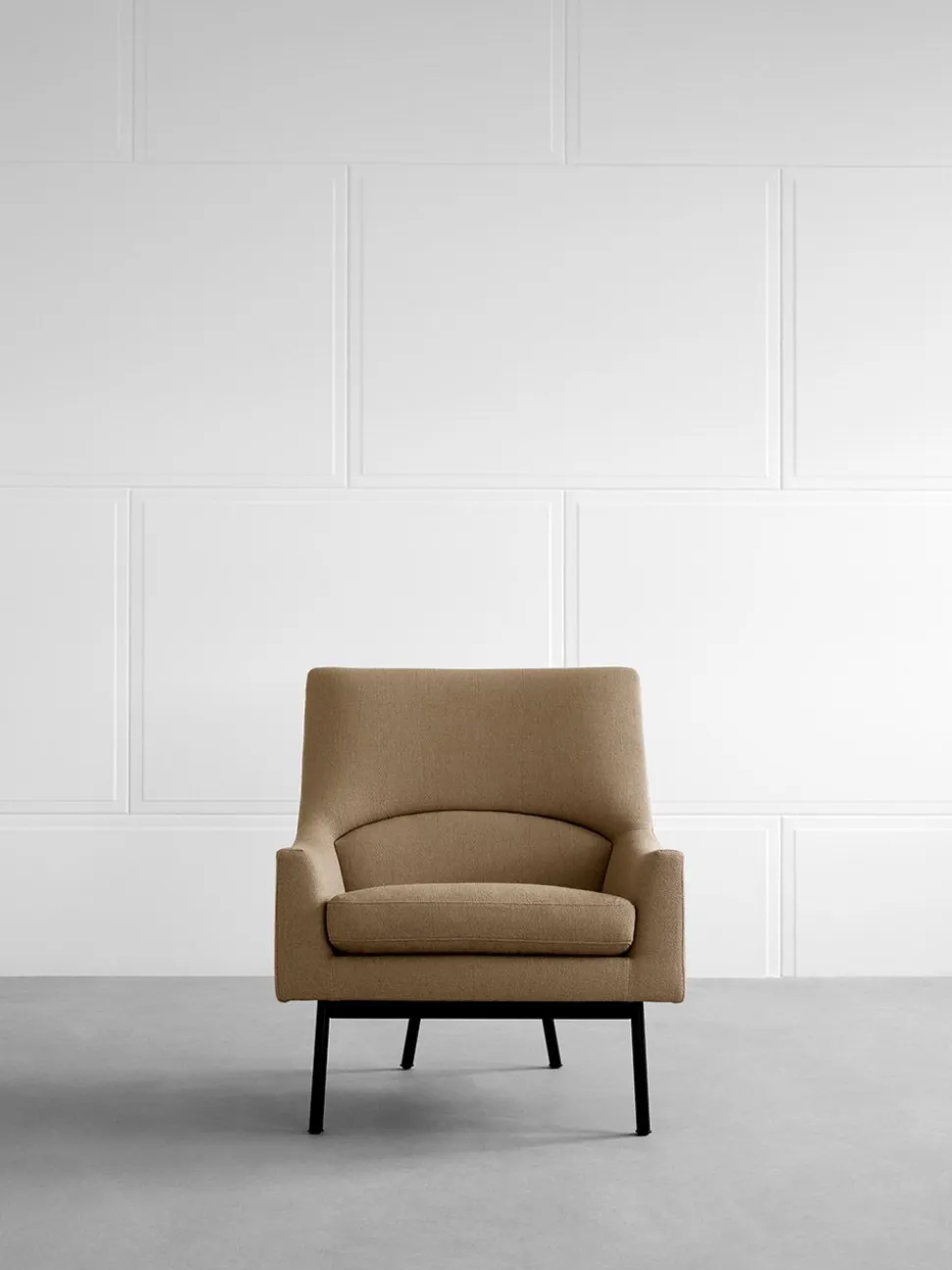 - Gestell aus schwarz lackiertem Stahl. Sitz mit blindem Gestell aus Holz, gepolstert mit HR- oder CMHR-Schaum und bezogen mit dem gewünschten Stoff. Passende abnehmbare Rücken- und Sitzkissen mit Schaumstoffkern und Daunenfedern.